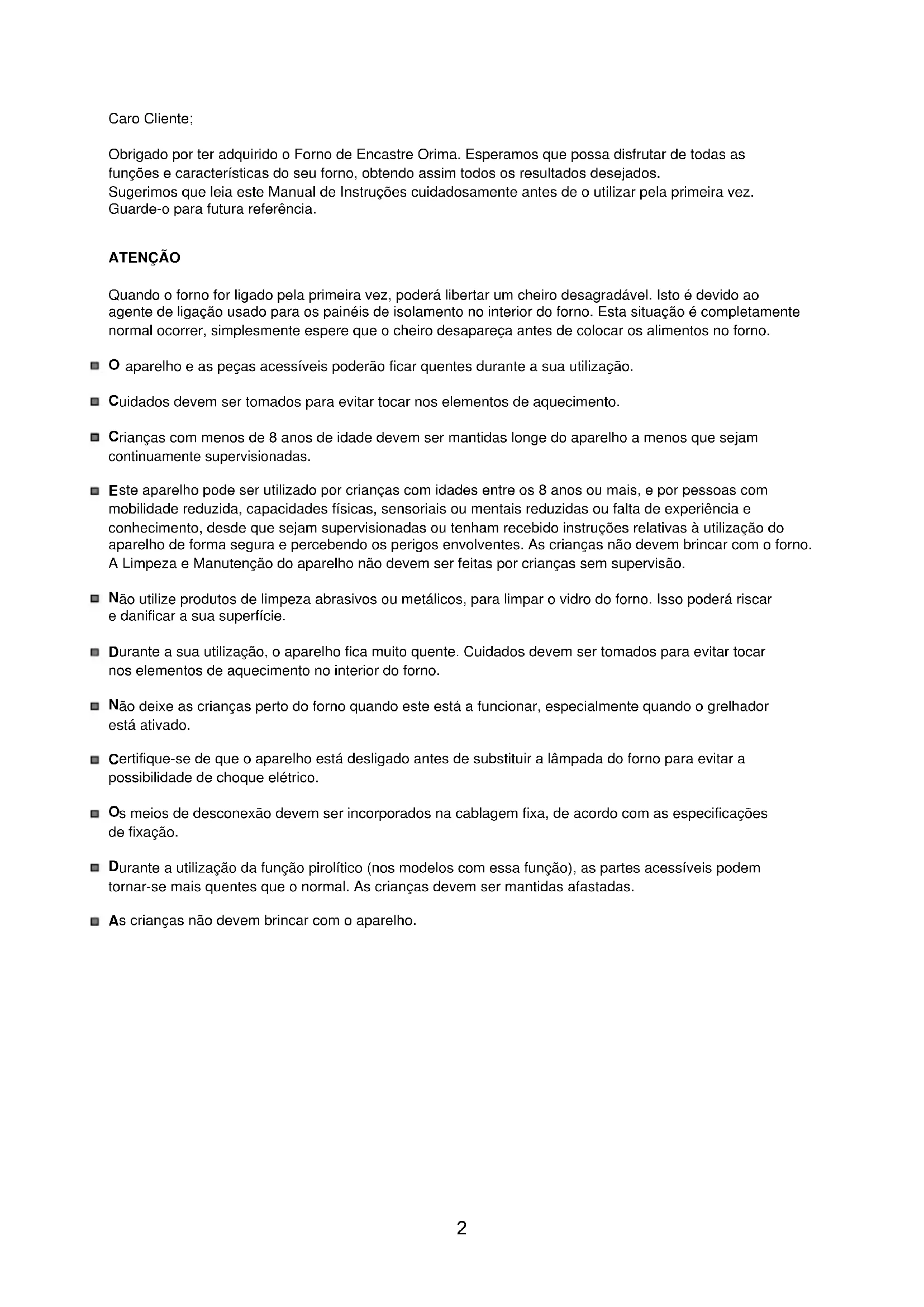 Obrigado por ter adquirido o Forno de Encastre Orima. Esperamos que possa disfrutar de todas as funções e características do seu forno, obtendo assim todos os resultados desejados. Sugerimos que leia este Manual de Instruções cuidadosamente antes de o utilizar pela primeira vez. Guarde-o para futura referência.