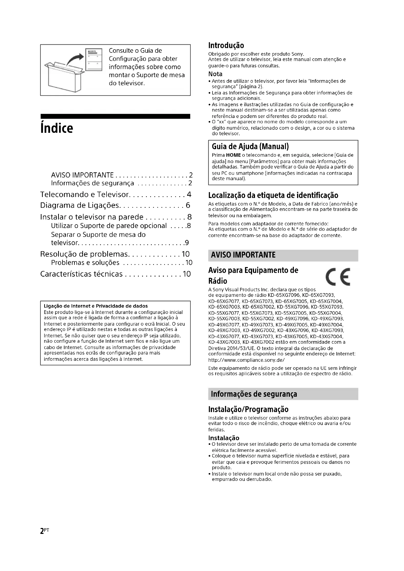 - Antes de utilizar o televisor, por favor leia “Informações de segurança” (página 2).• Leia as Informações de Segurança para obter informações de segurança adicionais.• As imagens e ilustrações utilizadas no Guia de configuração e neste manual destinam-se a ser utilizadas apenas como referência e podem ser diferentes do produto real.• O “xx” que aparece no nome do modelo corresponde a um dígito numérico, relacionado com o design, a cor ou o sistema do televisor. Localização da etiqueta de identificação As etiquetas com o N.º de Modelo, a Data de Fabrico (ano/mês) e a classificação de Alimentação encontram-se na parte traseira do televisor ou na embalagem.Para modelos com adaptador de corrente fornecido:As etiquetas com o N.º de Modelo e N.º de série do adaptador de corrente encontram-se na base do adaptador de corrente. AVISO IMPORTANTE Aviso para Equipamento de Rádio A Sony Visual Products Inc. declara que os tipos de equipamento de rádio KD-65XG7096, KD-65XG7093, KD-65XG7077, KD-65XG7073, KD-65XG7005, KD-65XG7004, KD-65XG7003, KD-65XG7002, KD-55XG7096, KD-55XG7093, KD-55XG7077, KD-55XG7073, KD-55XG7005, KD-55XG7004, KD-55XG7003, KD-55XG7002, KD-49XG7096, KD-49XG7093, KD-49XG7077, KD-49XG7073, KD-49XG7005, KD-49XG7004, KD-49XG7003, KD-49XG7002, KD-43XG7096, KD-43XG7093, KD-43XG7077, KD-43XG7073, KD-43XG7005, KD-43XG7004, KD-43XG7003, KD-43XG7002 estão em conformidade com a Diretiva 2014/53/UE. O texto integral da declaração de conformidade está disponível no seguinte endereço de Internet: http://www.compliance.sony.de/Este equipamento de rádio pode ser operado na UE sem infringir os requisitos aplicáveis sobre a utilização de espectro de rádio. Informações de segurança Instalação/Programação Instale e utilize o televisor conforme as instruções abaixo para evitar todo o risco de incêndio, choque elétrico ou avaria e/ou feridas. Instalação