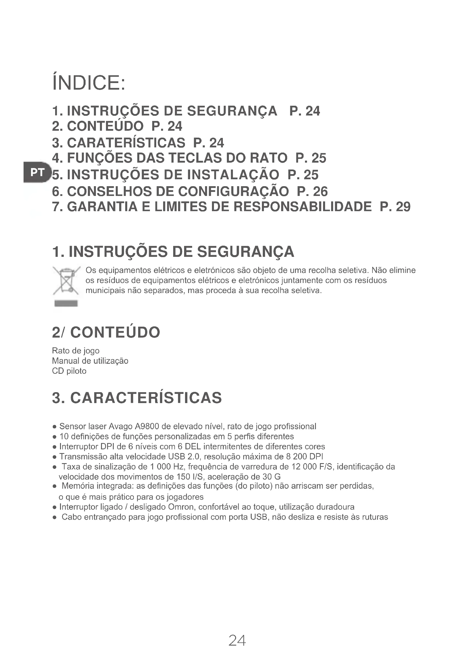 Os equipamentos elétricos e eletrónicos são objeto de uma recolha seletiva. Não elimine os resíduos de equipamentos elétricos e eletrónicos juntamente com os resíduos municipais não separados, mas proceda à sua recolha seletiva. 2/ CONTEÚDO Rato de jogo Manual de utilização CD piloto