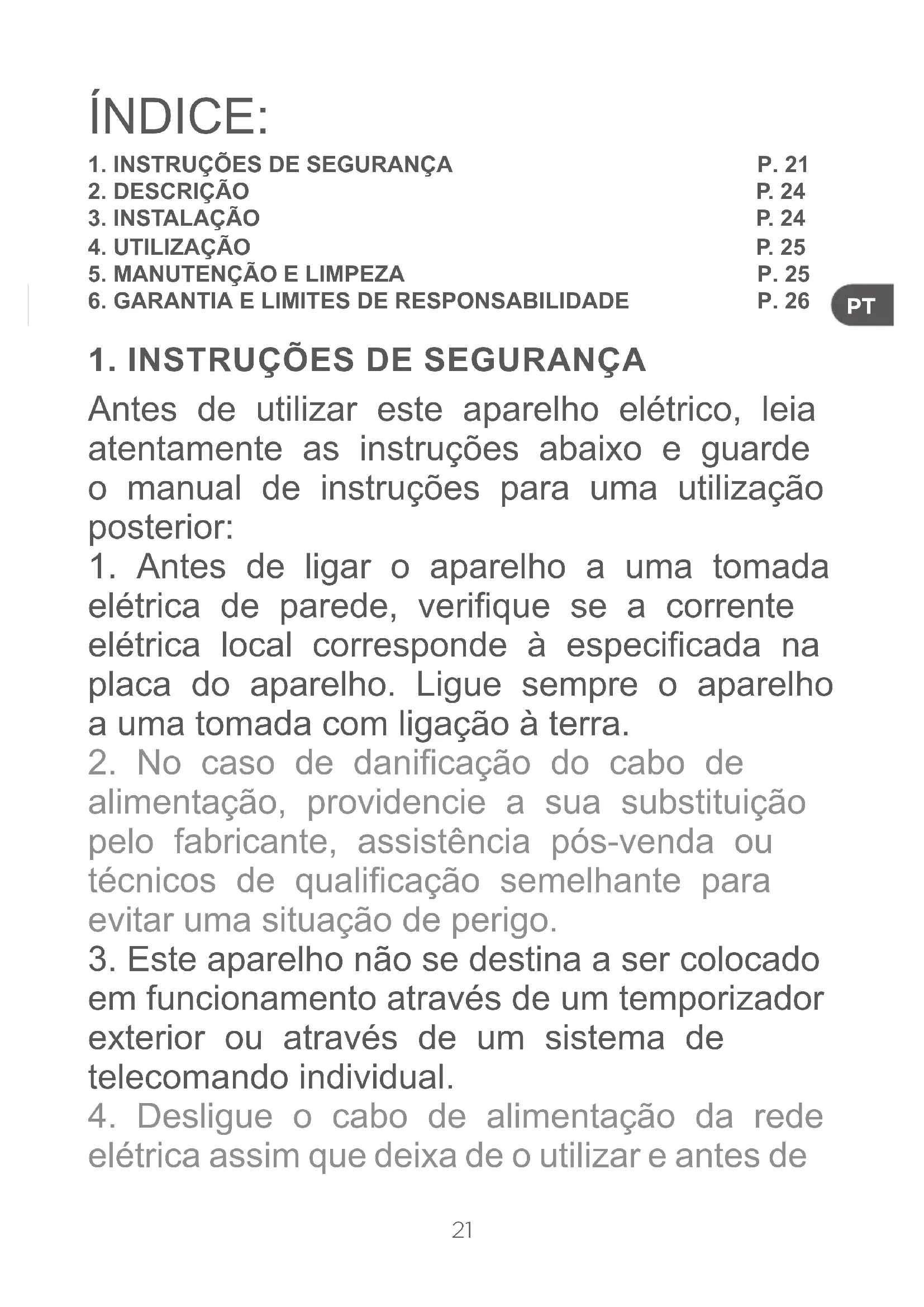 elétrica assim que deixa de o utilizar e antes de ÍNDICE: