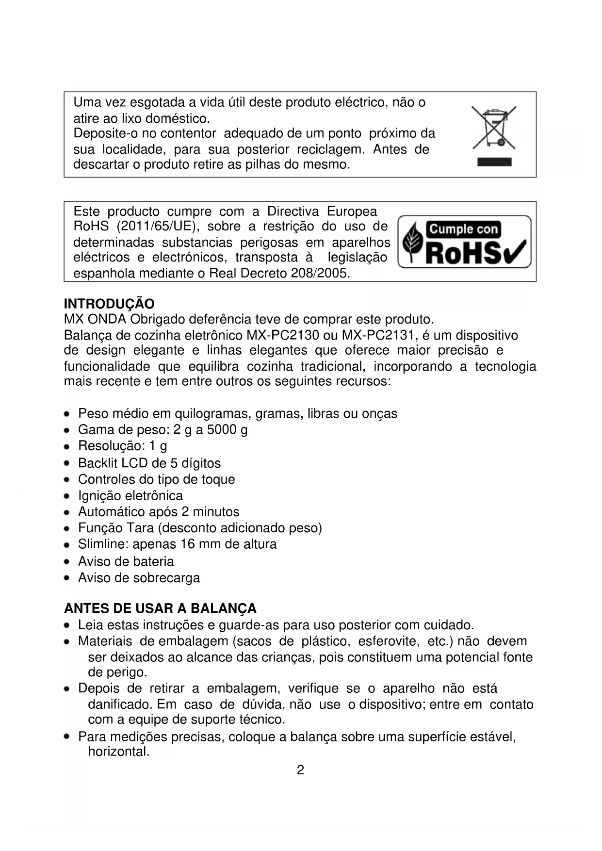 Este producto cumpre com a Directiva Europea RoHS (2011/65/UE), sobre a restrição do uso de determinadas substancias perigosas em aparelhos eléctricos e electrónicos, transposta à legislação espanhola mediante o Real Decreto 208/2005. INTRODUÇÃO MX ONDA Obrigado deferência teve de comprar este produto. Balança de cozinha eletrônico MX-PC2130 ou MX-PC2131, é um dispositivo de design elegante e linhas elegantes que oferece maior precisão e funcionalidade que equilibra cozinha tradicional, incorporando a tecnologia mais recente e tem entre outros os seguintes recursos: Peso médio em quilogramas, gramas, libras ou onças Gama de peso: 2 g a 5000 g Resolução: 1 g Backlit LCD de 5 dígitos Controles do tipo de toque Ignição eletrônica Automático após 2 minutos Função Tara (desconto adicionado peso) Slimline: apenas 16 mm de altura Aviso de bateria Aviso de sobrecarga