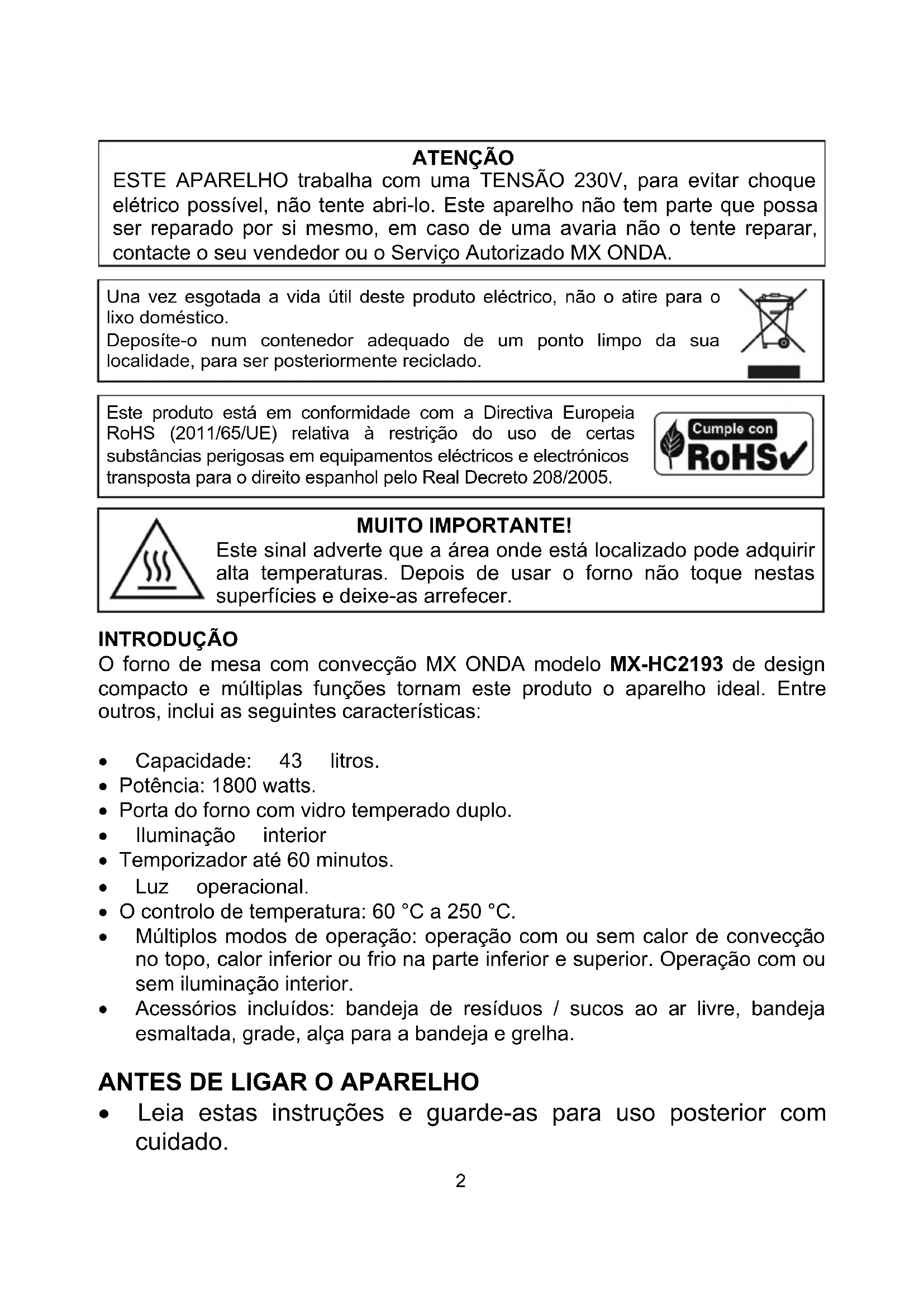 MUITO IMPORTANTE! Este sinal adverte que a área onde está localizado pode adquirir alta temperaturas. Depois de usar o forno não toque nestas superfícies e deixe-as arrefecer. INTRODUÇÃO O forno de mesa com convecção MX ONDA modelo MX-HC2193 de design compacto e múltiplas funções tornam este produto o aparelho ideal. Entre outros, inclui as seguintes características: