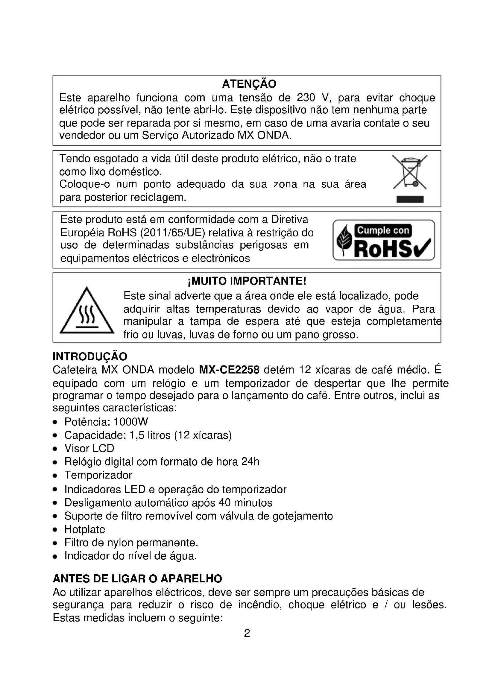 ATENÇÃO Este aparelho funciona com uma tensão de 230 V, para evitar choque elétrico possível, não tente abri-lo. Este dispositivo não tem nenhuma parte que pode ser reparada por si mesmo, em caso de uma avaria contate o seu vendedor ou um Serviço Autorizado MX ONDA. Tendo esgotado a vida útil deste produto elétrico, não o trate como lixo doméstico. Coloque-o num ponto adequado da sua zona na sua área para posterior reciclagem. Este produto está em conformidade com a Diretiva Européia RoHS (2011/65/UE) relativa à restrição do uso de determinadas substâncias perigosas em equipamentos eléctricos e electrónicos ¡MUITO IMPORTANTE! Este sinal adverte que a área onde ele está localizado, pode adquirir altas temperaturas devido ao vapor de água. Para manipular a tampa de espera até que esteja completamente frio ou luvas, luvas de forno ou um pano grosso. INTRODUÇÃO Cafeteira MX ONDA modelo MX-CE2258 detém 12 xícaras de café médio. É equipado com um relógio e um temporizador de despertar que lhe permite programar o tempo desejado para o lançamento do café. Entre outros, inclui as seguintes características: Potência: 1000W Capacidade: 1,5 litros (12 xícaras) Visor LCD Relógio digital com formato de hora 24h Temporizador Indicadores LED e operação do temporizador Desligamento automático após 40 minutos Suporte de filtro removível com válvula de gotejamento Hotplate Filtro de nylon permanente. Indicador do nível de água.