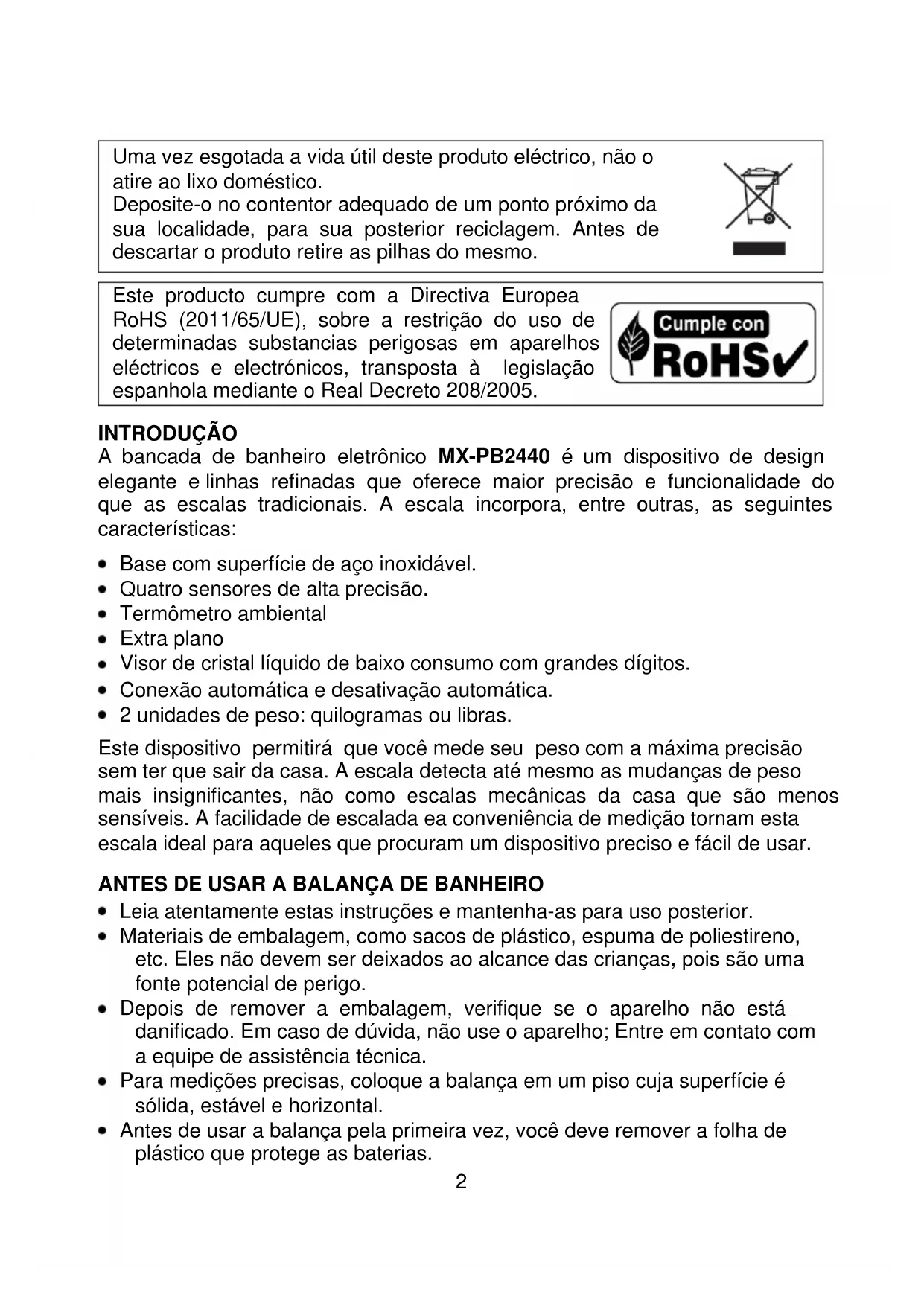 Uma vez esgotada a vida útil deste produto eléctrico, não o atire ao lixo doméstico. Deposite-o no contentor adequado de um ponto próximo da sua localidade, para sua posterior reciclagem. Antes de descartar o produto retire as pilhas do mesmo. Este producto cumpre com a Directiva Europea RoHS (2011/65/UE), sobre a restrição do uso de determinadas substancias perigosas em aparelhos eléctricos e electrónicos, transposta à legislação espanhola mediante o Real Decreto 208/2005. INTRODUÇÃO A bancada de banheiro eletrônico MX-PB2440 é um dispositivo de design elegante e linhas refinadas que oferece maior precisão e funcionalidade do que as escalas tradicionais. A escala incorpora, entre outras, as seguintes características: Base com superfície de aço inoxidável. Quatro sensores de alta precisão. Termômetro ambiental Extra plano Visor de cristal líquido de baixo consumo com grandes dígitos. Conexão automática e desativação automática. 2 unidades de peso: quilogramas ou libras. Este dispositivo permitirá que você mede seu peso com a máxima precisão sem ter que sair da casa. A escala detecta até mesmo as mudanças de peso mais insignificantes, não como escalas mecânicas da casa que são menos sensíveis. A facilidade de escalada ea conveniência de medição tornam esta escala ideal para aqueles que procuram um dispositivo preciso e fácil de usar. ANTES DE USAR A BALANÇA DE BANHEIRO Leia atentamente estas instruções e mantenha-as para uso posterior. Materiais de embalagem, como sacos de plástico, espuma de poliestireno, etc. Eles não devem ser deixados ao alcance das crianças, pois são uma fonte potencial de perigo. Depois de remover a embalagem, verifique se o aparelho não está danificado. Em caso de dúvida, não use o aparelho; Entre em contato com a equipe de assistência técnica. Para medições precisas, coloque a balança em um piso cuja superfície é sólida, estável e horizontal. Antes de usar a balança pela primeira vez, você deve remover a folha de plástico que protege as baterias.3