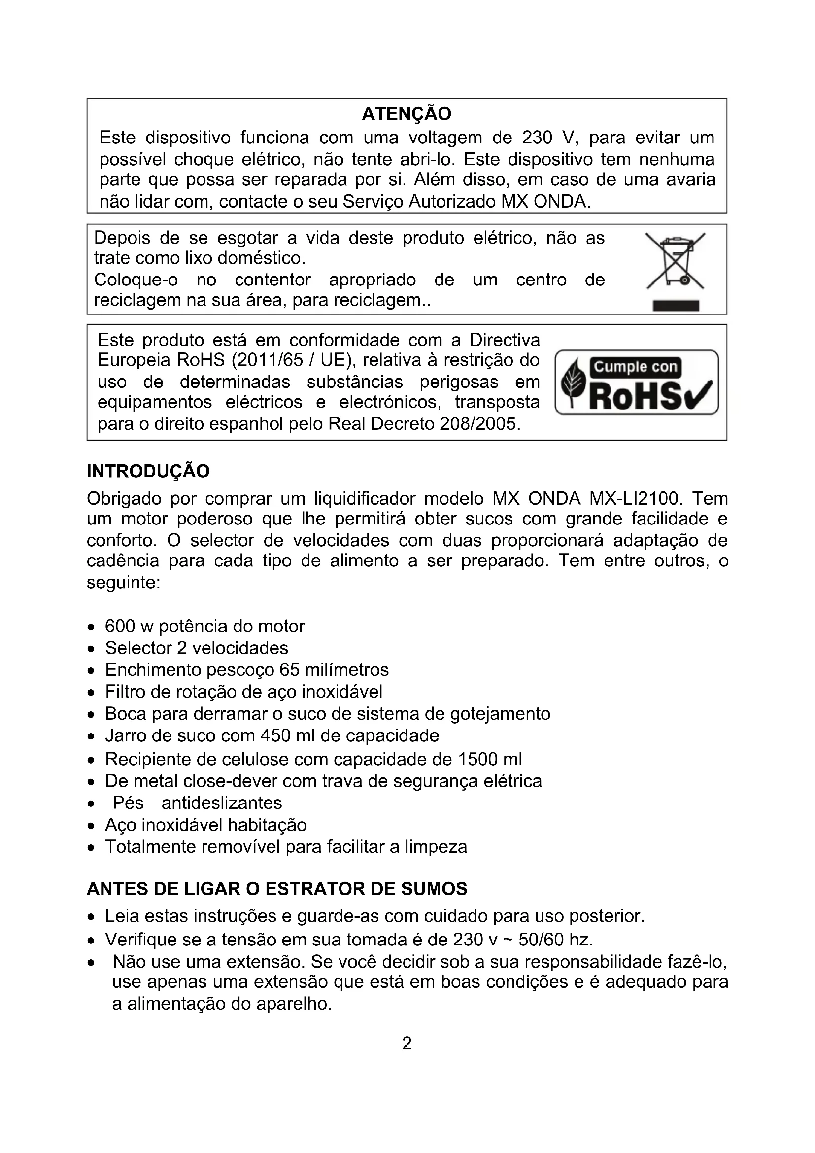 Obrigado por comprar um liquidificado modelo MX ONDA MX-LI2100. Tem um motor poderoso que lhe permitirá obter sucos com grande dificuldade e comfortso. O selector de velocidades com das proporcionará adaptação de cadência para cada tipo de alimento a ser preparado. Tem entre outros, o seguito: