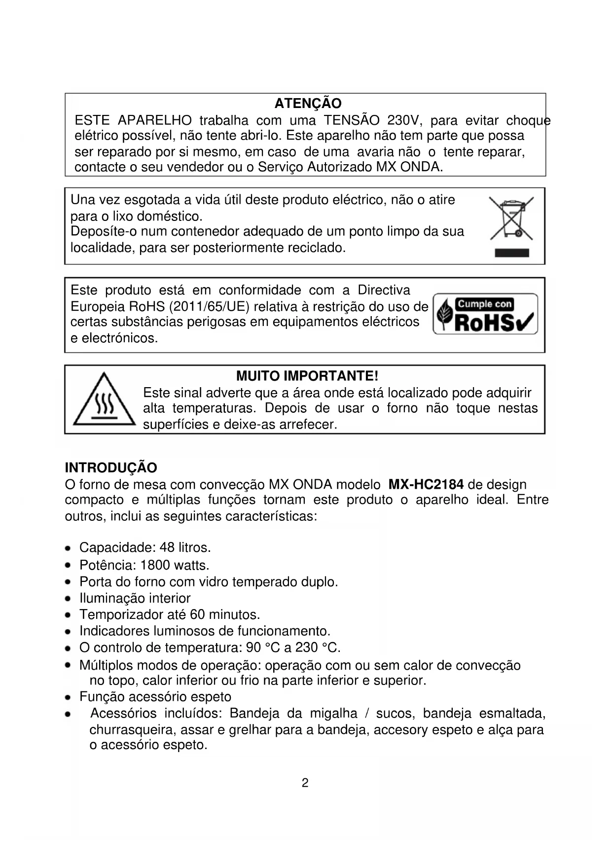 MANUAL DE UTILIZADOR MXHC2184 Mx Onda