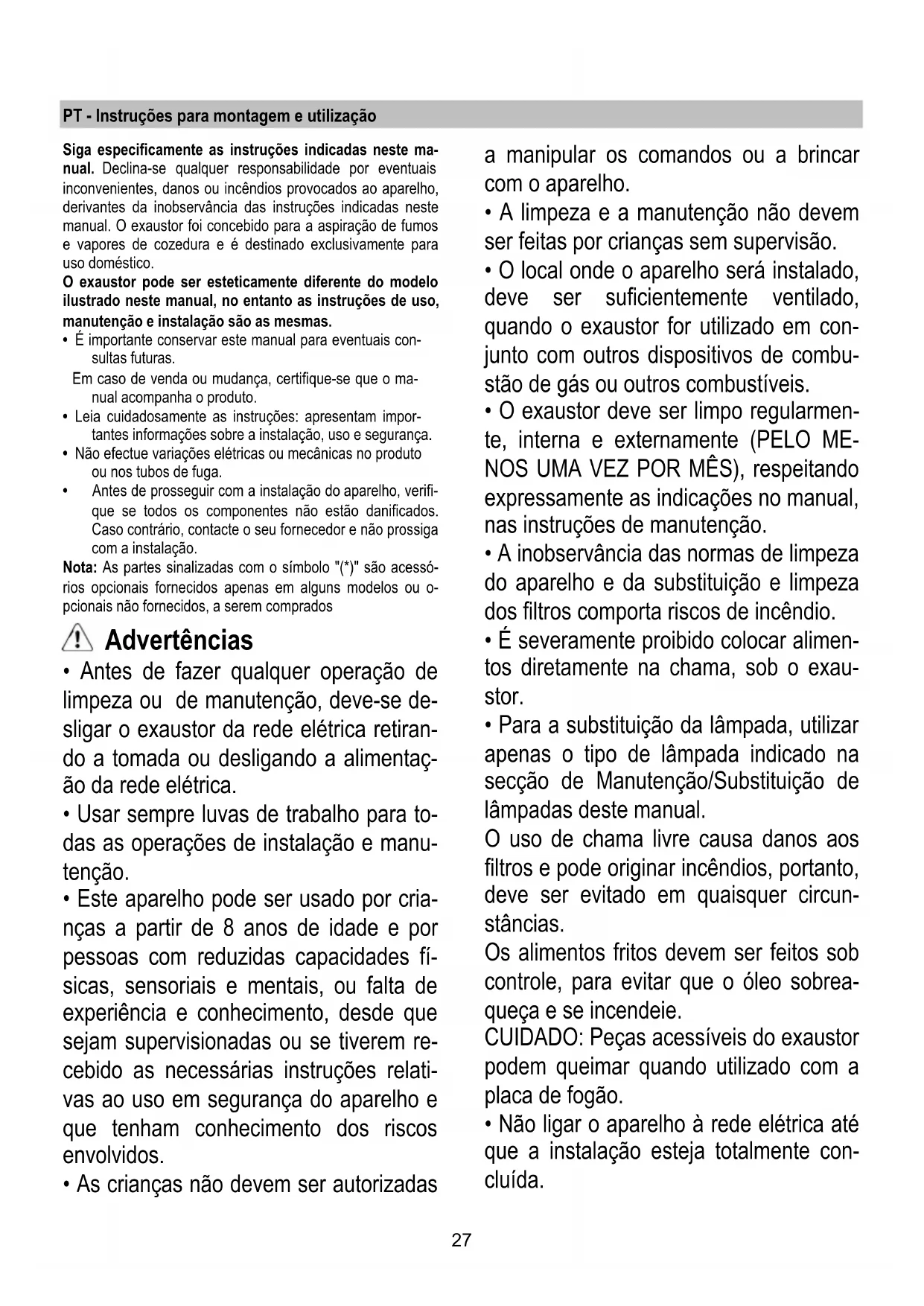 Volver a montar la rejilla. Si la iluminación no funciona, antes de llamar al servicio de asistencia técnica, revisar que las lámparas estén correcta- mente instaladas.27 PT - Instruções para montagem e utilização Siga especificamente as instruções indicadas neste ma- nual. Declina-se qualquer responsabilidade por eventuais inconvenientes, danos ou incêndios provocados ao aparelho, derivantes da inobservância das instruções indicadas neste manual. O exaustor foi concebido para a aspiração de fumos e vapores de cozedura e é destinado exclusivamente para uso doméstico. O exaustor pode ser esteticamente diferente do modelo ilustrado neste manual, no entanto as instruções de uso, manutenção e instalação são as mesmas.
