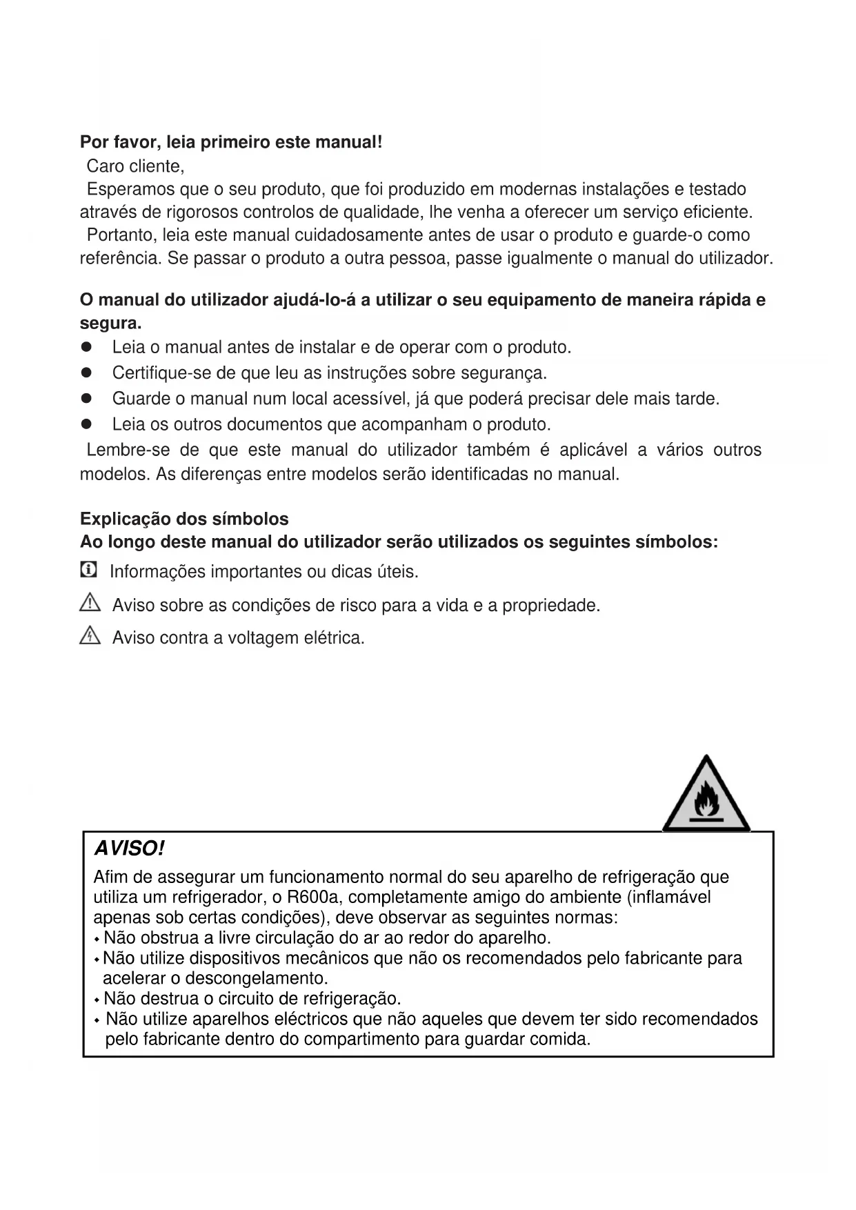 - Es posible que algún alimento toque el techo del cajón. >>>Cambie la distribución de los alimentos en el cajón.Por favor, leia primeiro este manual! Caro cliente, Esperamos que o seu produto, que foi produzido em modernas instalações e testado através de rigorosos controlos de qualidade, lhe venha a oferecer um serviço eficiente. Portanto, leia este manual cuidadosamente antes de usar o produto e guarde-o como referência. Se passar o produto a outra pessoa, passe igualmente o manual do utilizador. O manual do utilizador ajudá-lo-á a utilizar o seu equipamento de maneira rápida e segura. Leia o manual antes de instalar e de operar com o produto. Certifique-se de que leu as instruções sobre segurança. Guarde o manual num local acessível, já que poderá precisar dele mais tarde. Leia os outros documentos que acompanham o produto. Lembre-se de que este manual do utilizador também é aplicável a vários outros modelos. As diferenças entre modelos serão identificadas no manual. Explicação dos símbolos Ao longo deste manual do utilizador serão utilizados os seguintes símbolos: Informações importantes ou dicas úteis. Aviso sobre as condições de risco para a vida e a propriedade. Aviso contra a voltagem elétrica. AVISO! Afim de assegurar um funcionamento normal do seu aparelho de refrigeração que utiliza um refrigerador, o R600a, completamente amigo do ambiente (inflamável apenas sob certas condições), deve observar as seguintes normas: Não obstrua a livre circulação do ar ao redor do aparelho. Não utilize dispositivos mecânicos que não os recomendados pelo fabricante para acelerar o descongelamento. Não destrua o circuito de refrigeração. Não utilize aparelhos eléctricos que não aqueles que devem ter sido recomendados pelo fabricante dentro do compartimento para guardar comida.ÍNDİCE 2 PT 1 O seu frigorífico 3 2 Avisos importantes de segurança 5 Uso pretendido...................................... 4 Segurança geral..................................... 5 Para produtos com um dispensador de água........................................................ 6 Segurança com crianças........................ 6 Conformidade com a Diretiva WEEE e Eliminação do Produto………………….. 6 Informação sobre a embalagem............. 7 Aviso HCA............................................... 7 O que se pode fazer para economizar energia…………………………………….. 7 3 Instalação 8 Pontos a ter em atenção ao recolocar o frigorífico................................................ 8 Antes de colocar o frigorífico em funcionamento,....................................... 8 Ligação elétrica....................................... 8 Eliminação da embalagem...................... 8 Eliminação do seu frigorífico velho......... 9 Colocação e instalação........................... 9 Substituir a lâmpada de iluminação ....... 9 Ajuste dos pés......................................... 9 4 Preparação 10 5 Utilização do seu frigorífico 11 Painel indicador................................. 11 Invertendo as portas ……………… 12 Congelar alimentos frescos............... 13 Compartimento para guardar alimentos perecíveis………….………………… 13 Recomendações para a preservação de alimentos congelados................... 14 Descongelação................................. 14 Colocar os alimentos......................... 14 Informação sobre congelação profunda (deep-freeze)...................... 15 Recomendações para o compartimento de alimentos frescos......................... 15 Sistema de arrefecimento duplo:....... 15 6 Manutenção e limpeza 16 Proteção das superfícies plásticas ........................................... 16 7 Resolução de problemas 17O seu frigorífico