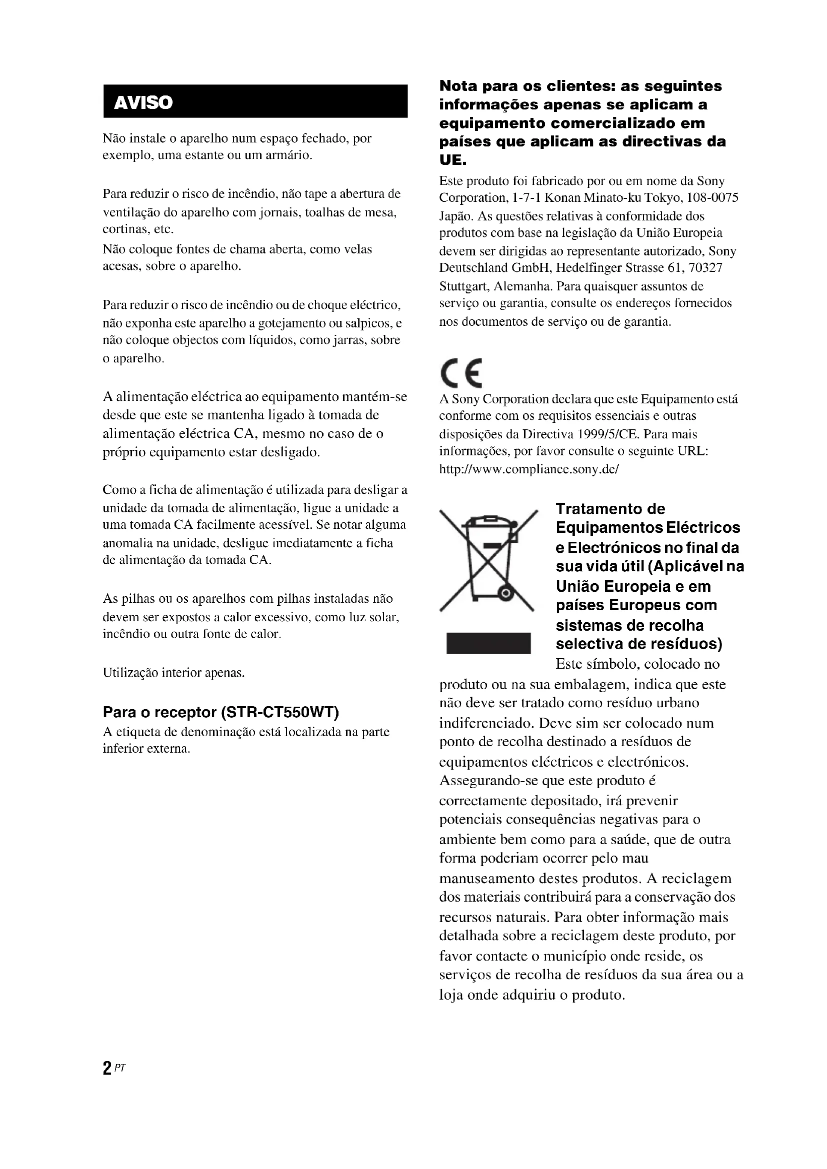 Não instale o aparelho num espaço fechado, por exemplo, uma estante ou um armário. Para reduzir o risco de incêndio, não tape a abertura de ventilação do aparelho com jornais, toalhas de mesa, cortinas, etc. Não coloque fontes de chama aberta, como velas acesas, sobre o aparelho. Para reduzir o risco de incêndio ou de choque eléctrico, não exponha este aparelho a gotejamento ou salpicos, e não coloque objectos com líquidos, como jarras, sobre o aparelho. A alimentação eléctrica ao equipamento mantém-se desde que este se mantenha ligado à tomada de alimentação eléctrica CA, mesmo no caso de o próprio equipamento estar desligado. Como a ficha de alimentação é utilizada para desligar a unidade da tomada de alimentação, ligue a unidade a uma tomada CA facilmente acessível. Se notar alguma anomalia na unidade, desligue imediatamente a ficha de alimentação da tomada CA. As pilhas ou os aparelhos com pilhas instaladas não devem ser expostos a calor excessivo, como luz solar, incêndio ou outra fonte de calor. Utilização interior apenas. Para o receptor (STR-CT550WT) A etiqueta de denominação está localizada na parte inferior externa. Nota para os clientes: as seguintes informações apenas se aplicam a equipamento comercializado em países que aplicam as directivas da UE. Este produto foi fabricado por ou em nome da Sony Corporation, 1-7-1 Konan Minato-ku Tokyo, 108-0075 Japão. As questões relativas à conformidade dos produtos com base na legislação da União Europeia devem ser dirigidas ao representante autorizado, Sony Deutschland GmbH, Hedelfinger Strasse 61, 70327 Stuttgart, Alemanha. Para quaisquer assuntos de serviço ou garantia, consulte os endereços fornecidos nos documentos de serviço ou de garantia. A Sony Corporation declara que este Equipamento está conforme com os requisitos essenciais e outras disposições da Directiva 1999/5/CE. Para mais informações, por favor consulte o seguinte URL: http://www.compliance.sony.de/ Tratamento de Equipamentos Eléctricos e Electrónicos no final da sua vida útil (Aplicável na União Europeia e em países Europeus com sistemas de recolha selectiva de resíduos) Este símbolo, colocado no produto ou na sua embalagem, indica que este não deve ser tratado como resíduo urbano indiferenciado. Deve sim ser colocado num ponto de recolha destinado a resíduos de equipamentos eléctricos e electrónicos. Assegurando-se que este produto é correctamente depositado, irá prevenir potenciais consequências negativas para o ambiente bem como para a saúde, que de outra forma poderiam ocorrer pelo mau manuseamento destes produtos. A reciclagem dos materiais contribuirá para a conservação dos recursos naturais. Para obter informação mais detalhada sobre a reciclagem deste produto, por favor contacte o município onde reside, os serviços de recolha de resíduos da sua área ou a loja onde adquiriu o produto. AVISO3