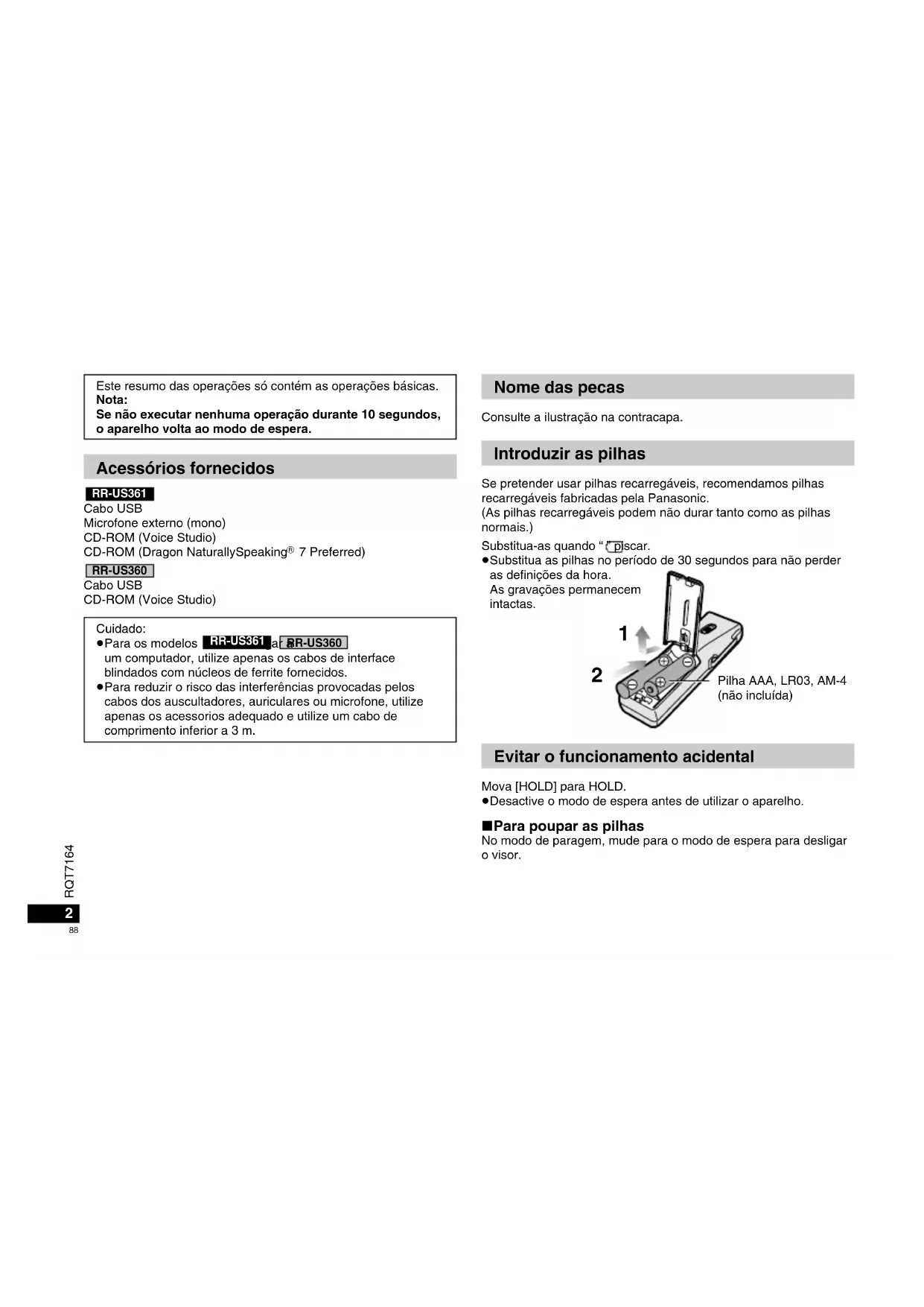 7 Preferred) Cabo USB CD-ROM (Voice Studio) RR-US360 RR-US361 Cuidado: ≥Para os modelos : Quando ligar a um computador, utilize apenas os cabos de interface blindados com núcleos de ferrite fornecidos. ≥Para reduzir o risco das interferências provocadas pelos cabos dos auscultadores, auriculares ou microfone, utilize apenas os acessorios adequado e utilize um cabo de comprimento inferior a 3 m. RR-US360 RR-US361 Este resumo das operações só contém as operações básicas. Nota: Se não executar nenhuma operação durante 10 segundos, o aparelho volta ao modo de espera. Nome das pecas Consulte a ilustração na contracapa. Introduzir as pilhas Se pretender usar pilhas recarregáveis, recomendamos pilhas recarregáveis fabricadas pela Panasonic. (As pilhas recarregáveis podem não durar tanto como as pilhas normais.) Substitua-as quando “ ” piscar. ≥Substitua as pilhas no período de 30 segundos para não perder as definições da hora. As gravações permanecem intactas. Evitar o funcionamento acidental Mova [HOLD] para HOLD. ≥Desactive o modo de espera antes de utilizar o aparelho. ∫ Para poupar as pilhas No modo de paragem, mude para o modo de espera para desligar o visor. Pilha AAA, LR03, AM-4 (não incluída)