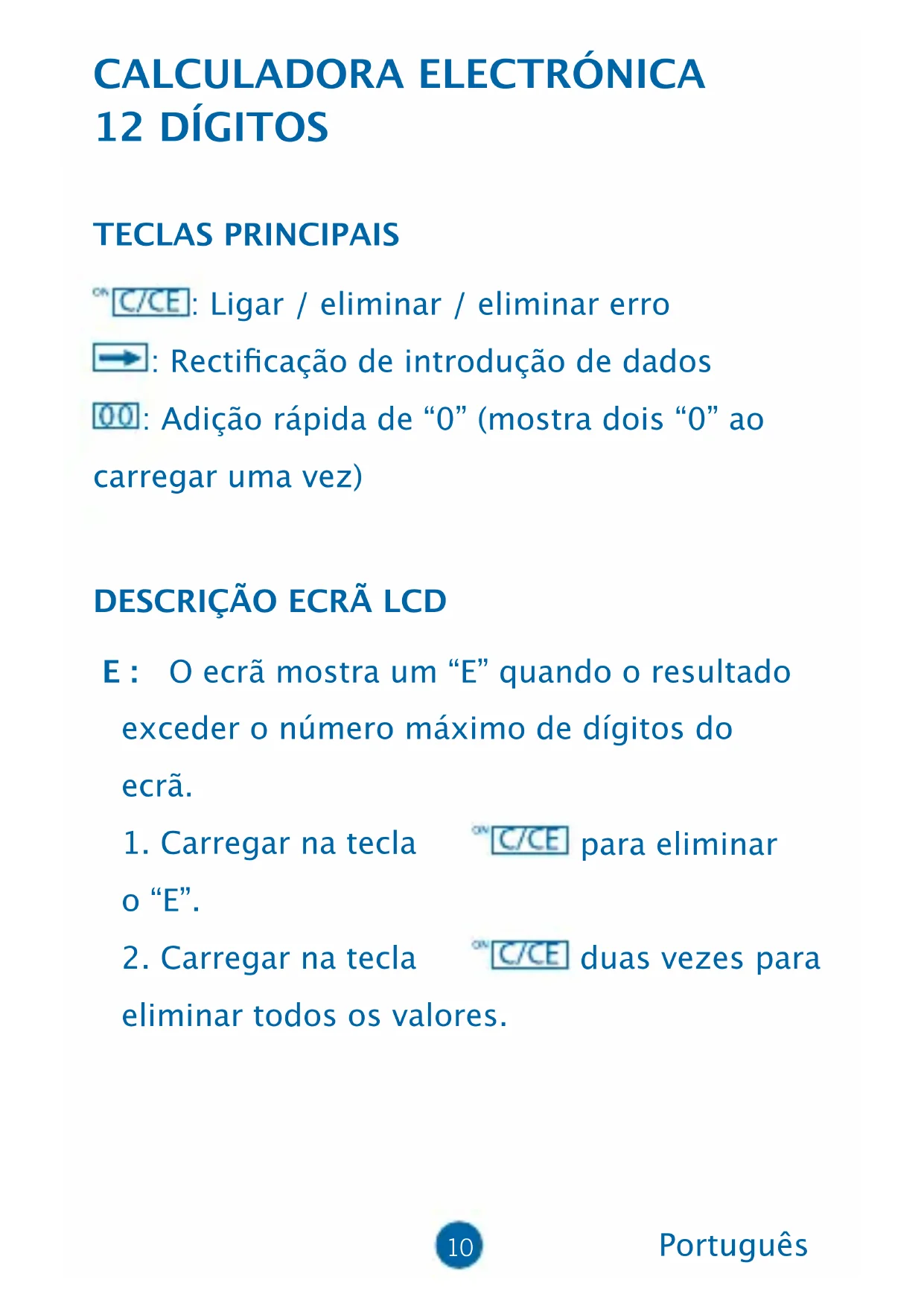 12 DÍGITOS TECLAS PRINCIPAIS : Ligar / eliminar / eliminar erro : Recticação de introdução de dados : Adição rápida de “0” (mostra dois “0” ao carregar uma vez)