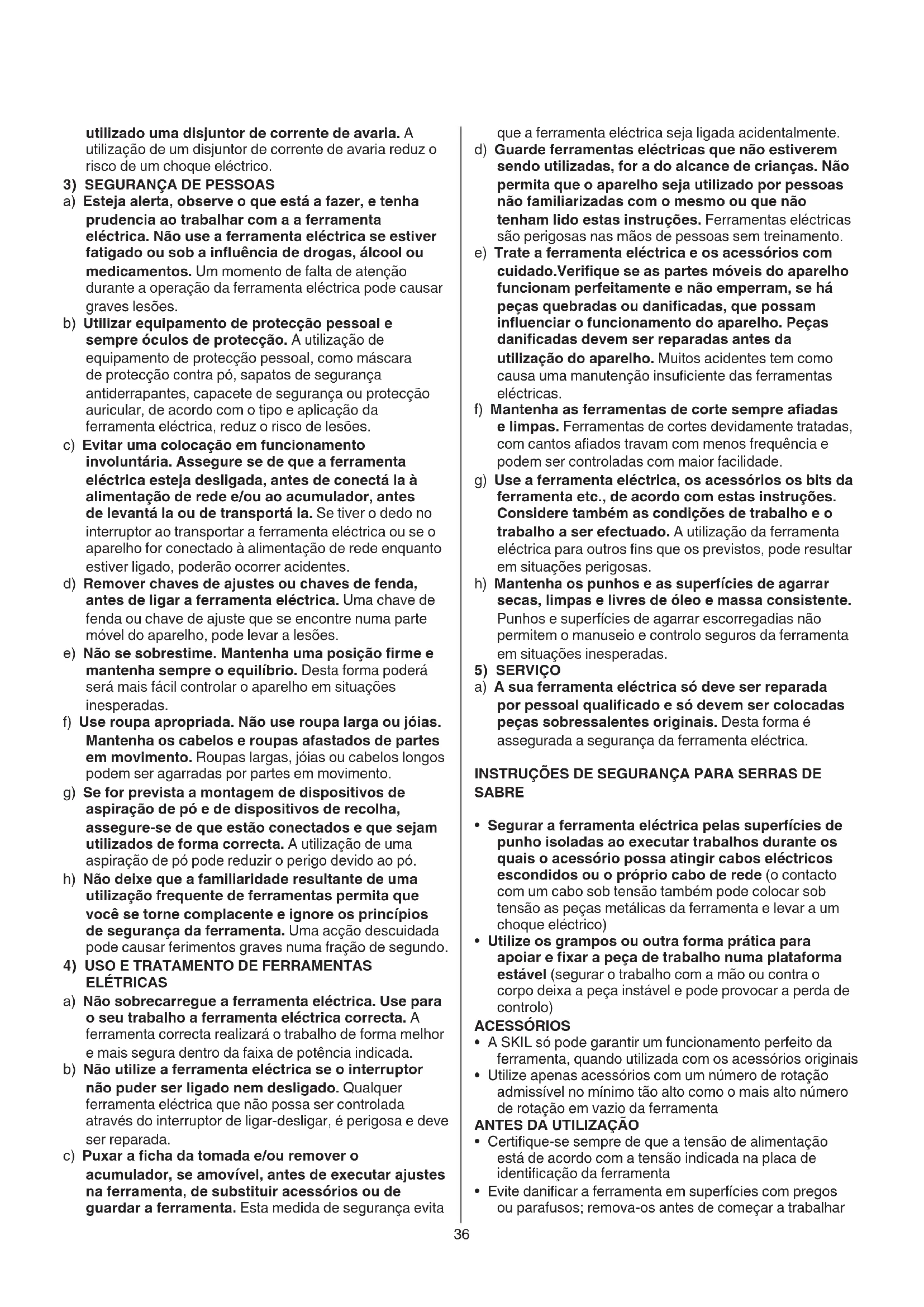 a) A sua ferramenta eléctrica só deve ser reparada por pessoal qualicado e só devem ser colocadas peças sobressalentes originais. Desta forma é assegurada a segurança da ferramenta eléctrica. INSTRUÇÕES DE SEGURANÇA PARA SERRAS DE SABRE