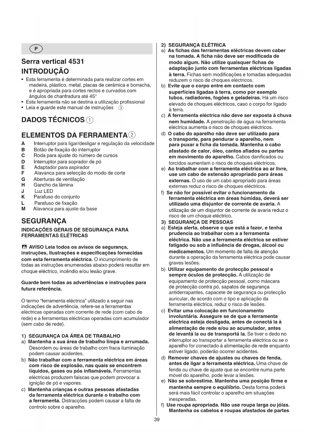 A Interruptor para ligar/desligar e regulação da velocidade B Botão de xação do interruptor C Roda para ajuste do número de cursos D Interruptor para soprador de pó E Adaptador para aspirador F Alavanca para selecção do modo de corte G Aberturas de ventilação H Gancho da lâmina J Luz LED K Parafuso do conjunto L Parafuso de xação M Alavanca para ajuste da base SEGURANÇA INDICAÇÕES GERAIS DE SEGURANÇA PARA
