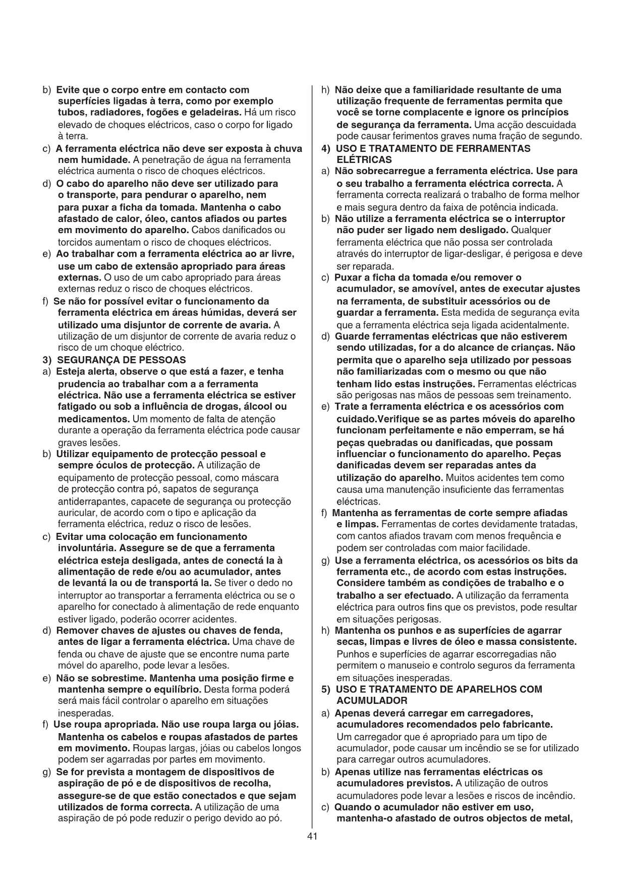 - A ferramenta é determinada para furar em madeira, metal, tijolos, pedras, cerâmica e plástico; ferramentas41 h) Não deixe que a familiaridade resultante de uma utilização frequente de ferramentas permita que você se torne complacente e ignore os princípios de segurança da ferramenta. Uma acção descuidada pode causar ferimentos graves numa fração de segundo.