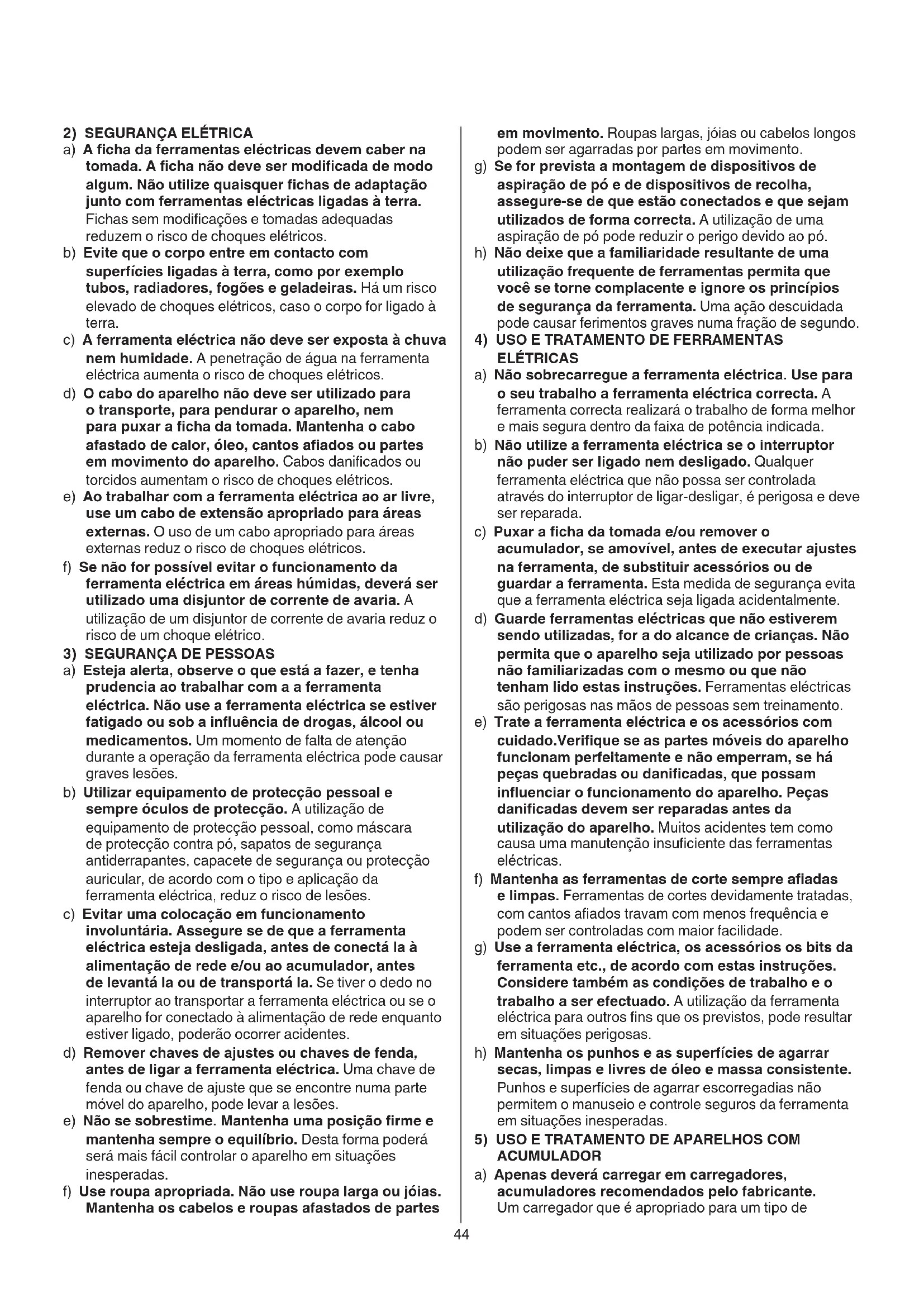 a) Esteja alerta, observe o que está a fazer, e tenha prudencia ao trabalhar com a a ferramenta eléctrica. Não use a ferramenta eléctrica se estiver fatigado ou sob a inuência de drogas, álcool ou medicamentos. Um momento de falta de atenção durante a operação da ferramenta eléctrica pode causar graves lesões. b) Utilizar equipamento de protecção pessoal e sempre óculos de protecção. A utilização de equipamento de protecção pessoal, como máscara de protecção contra pó, sapatos de segurança antiderrapantes, capacete de segurança ou protecção auricular, de acordo com o tipo e aplicação da ferramenta eléctrica, reduz o risco de lesões. c) Evitar uma colocação em funcionamento involuntária. Assegure se de que a ferramenta eléctrica esteja desligada, antes de conectá la à alimentação de rede e/ou ao acumulador, antes de levantá la ou de transportá la. Se tiver o dedo no interruptor ao transportar a ferramenta eléctrica ou se o aparelho for conectado à alimentação de rede enquanto estiver ligado, poderão ocorrer acidentes. d) Remover chaves de ajustes ou chaves de fenda, antes de ligar a ferramenta eléctrica. Uma chave de fenda ou chave de ajuste que se encontre numa parte móvel do aparelho, pode levar a lesões. e) Não se sobrestime. Mantenha uma posição rme e mantenha sempre o equilíbrio. Desta forma poderá será mais fácil controlar o aparelho em situações inesperadas. f) Use roupa apropriada. Não use roupa larga ou jóias. Mantenha os cabelos e roupas afastados de partes45