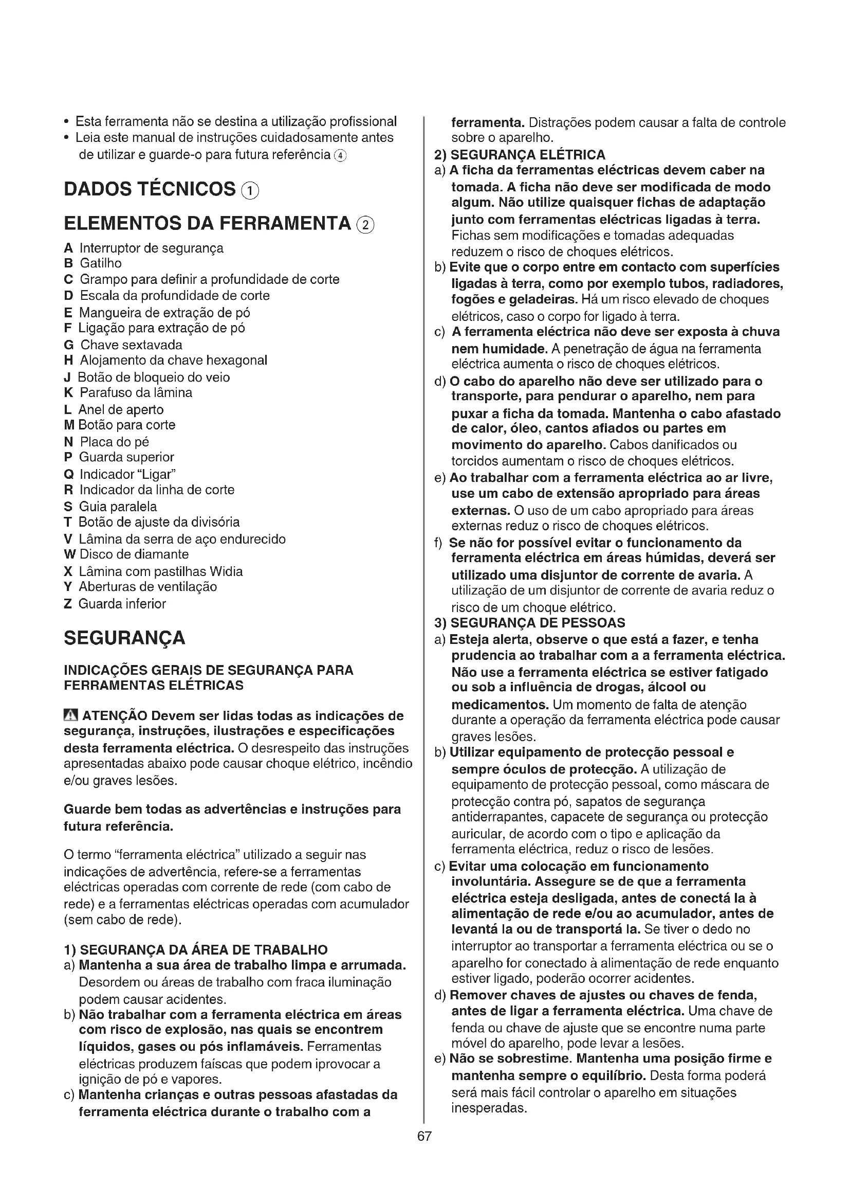 A Interruptor de segurança B Gatilho C Grampo para denir a profundidade de corte D Escala da profundidade de corte E Mangueira de extração de pó F Ligação para extração de pó G Chave sextavada H Alojamento da chave hexagonal J Botão de bloqueio do veio K Parafuso da lâmina L Anel de aperto M Botão para corte N Placa do pé P Guarda superior Q Indicador “Ligar” R Indicador da linha de corte S Guia paralela T Botão de ajuste da divisória V Lâmina da serra de aço endurecido W Disco de diamante X Lâmina com pastilhas Widia Y Aberturas de ventilação Z Guarda inferior SEGURANÇA INDICAÇÕES GERAIS DE SEGURANÇA PARA