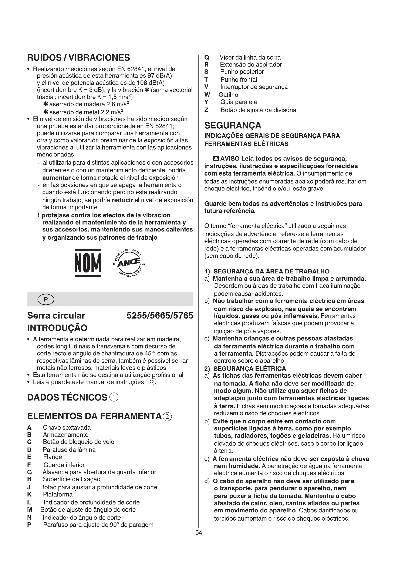 a) As chas das ferramentas eléctricas devem caber na tomada. A cha não deve ser modicada de modo algum. Não utilize quaisquer chas de adaptação junto com ferramentas eléctricas ligadas à terra. Fichas sem modicações e tomadas adequadas reduzem o risco de choques eléctricos. b) Evite que o corpo entre em contacto com superfícies ligadas à terra, como por exemplo tubos, radiadores, fogões e geladeiras. Há um risco elevado de choques eléctricos, caso o corpo for ligado à terra. c) A ferramenta eléctrica não deve ser exposta à chuva nem humidade. A penetração de água na ferramenta eléctrica aumenta o risco de choques eléctricos. d) O cabo do aparelho não deve ser utilizado para o transporte, para pendurar o aparelho, nem para puxar a cha da tomada. Mantenha o cabo afastado de calor, óleo, cantos aados ou partes em movimento do aparelho. Cabos danicados ou torcidos aumentam o risco de choques eléctricos. RUIDOS / VIBRACIONES