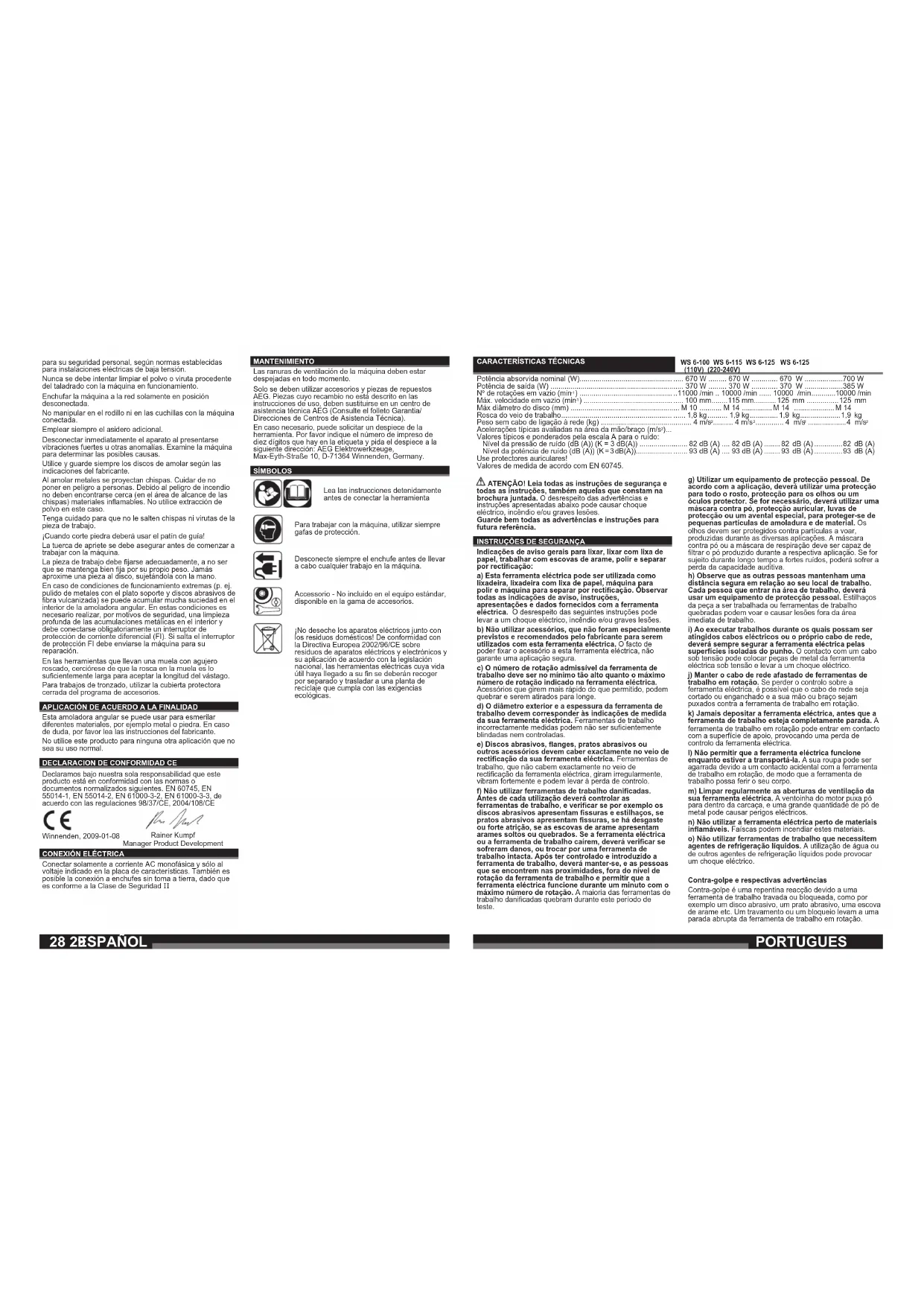 Só conectar à corrente alternada monofásica e só à tensão de rede indicada na placa de potência. A conexão às tomadas de rede sem contacto de segurana também é possível, pois trata-se duma construção da classe de protecção II. MANUTENÇÃO Através dos rasgos de ventilação podem soprar-se com ar comprimido os depósitos de poeira no motor. Utilizar unicamente acessórios e peças sobresselentes da AEG. Sempre que a substituição de um componente não tenha sido descrita nas instruções, será de toda a conveniência mandar executar esse trabalho a um Serviço de Assistência AEG (veja o folheto Garantia/Endereços de Serviços de Assistência). A pedido e mediante indicação da referência de dez números que consta da chapa de características da máquina, pode requerer-se um desenho explosivo da ferramenta eléctrica a: AEG Elektrowerkzeuge, Max-Eyth-Straße 10, D-71364 Winnenden, Germany. SYMBOLE Leia atentamente o manual de instruções antes de colocar a máquina em funcionamento. Usar sempre óculos de protecção ao trabalhar com a máquina. Antes de efectuar qualquer intervenção na máquina, tirar a cha da tomada. Acessório - Não incluído no eqipamento normal, disponível como acessório. Não deite ferramentas eléctricas no lixo doméstico! De acordo com a directiva europeia 2002/96/CE sobre ferramentas eléctricas e electrónicas usadas e a transposição para as leis nacionais, as ferramentas eléctricas usadas devem ser recolhidas em separado e encaminhadas a uma instalação de reciclagem dos materiais ecológica. PORTUGUES32 33 WS 6-100 WS 6-115 WS 6-125 WS 6-125 (110V) (220-240V) ..... 670 W ......... 670 W ............. 670 W ...................700 W ..... 370 W ......... 370 W ............. 370 W ...................385 W ..11000 /min .. 10000 /min ...... 10000 /min ............10000 /min ..... 100 mm ........115 mm ........... 125 mm ................125 mm ... M 10 ........... M 14 ............... M 14 ....................M 14 ...... 1,8 kg .......... 1,9 kg .............. 1,9 kg ....................1,9 kg ......... 4 m/s