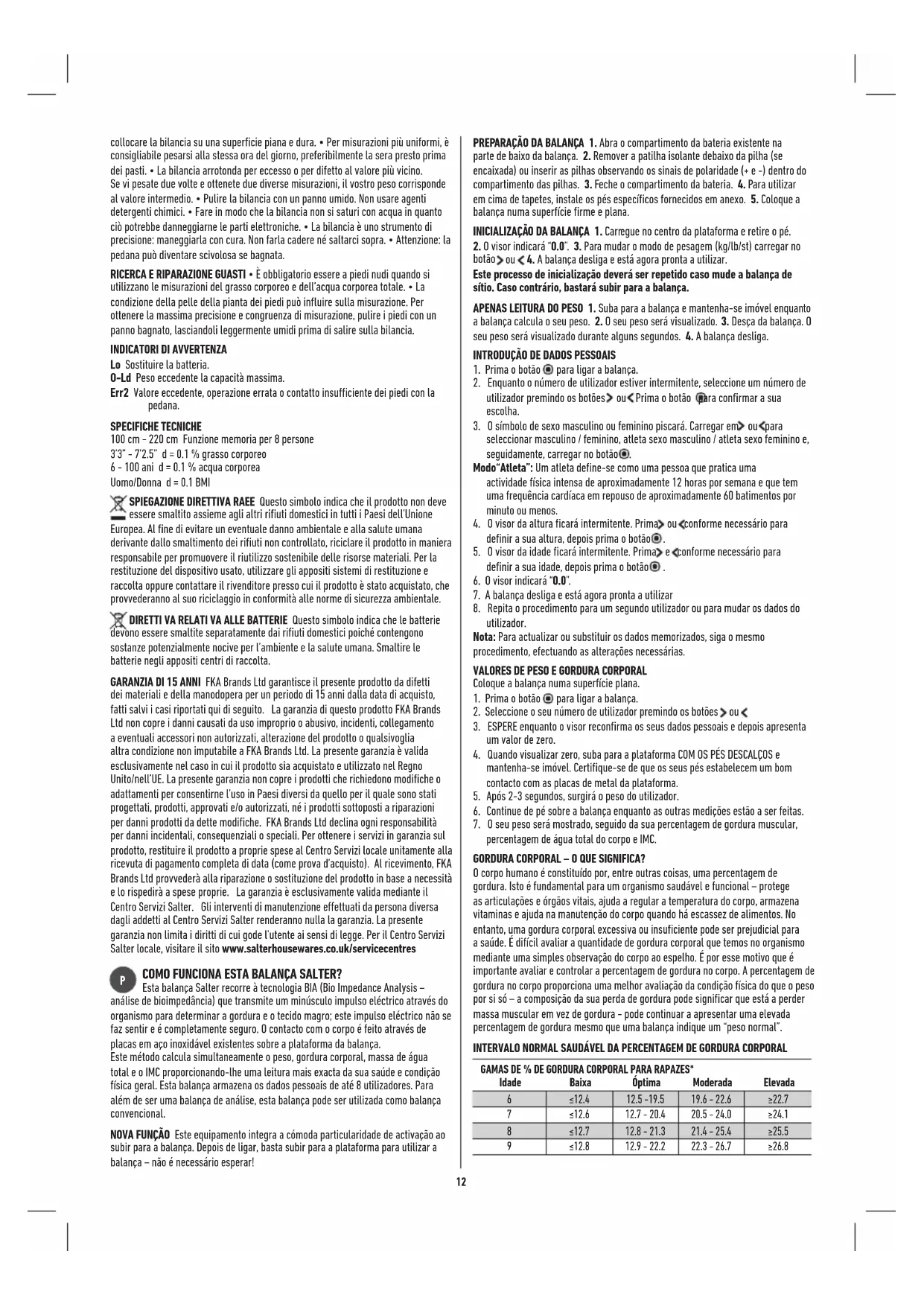 m14 equipamentos, mas antes utilizar sempre o mesmo equipamento para controlar qualquer alteração. Como é que interpreto os meus valores de gordura corporal e de percentagem de água no organismo? Consulte as tabelas de gordura corporal e de água no organismo que acompanham o equipamento. Essas tabelas ajudam-no a perceber se os valores da sua gordura corporal e água no organismo se enquadram numa categoria saudável (relativamente à sua idade e sexo). Como devo proceder se os meus valores de gordura corporal forem muito “altos”? Uma dieta sensata, ingestão de líquidos e um programa de exercício físico podem reduzir a sua percentagem de gordura corporal. Deve procurar-se sempre orientação médica profissional antes de se iniciar um programa com estas características. Por que motivo é que os limites de percentagem de gordura corporal são diferentes para homens e mulheres? É natural que as mulheres tenham uma maior percentagem de gordura do que os homens, pois a constituição do corpo é diferente, estando preparado para a gravidez, amamentação, etc. Como devo proceder se os meus valores de percentagem de água forem “baixos”? Certifique-se de que bebe água suficiente com regularidade e esforce-se por integrar a sua percentagem de gordura no limite saudável. Por que motivo devo evitar a utilização da Balança de Análise Corporal Salter durante a gravidez? Durante a gravidez, a composição do organismo das mulheres sofre consideráveis alterações para suportar o feto em desenvolvimento. Nestas circunstâncias, os valores da percentagem de gordura corporal podem ser pouco precisos e induzir em erro. Por conseguinte, as mulheres grávidas deverão utilizar apenas a função de peso. RECOMENDAÇÕES DE UTILIZAÇÃO E CUIDADOS • Pese-se sempre na mesma balança posicionada na mesma superfície. Não compare os pesos obtidos em diferentes balanças, já que se verificarão algumas diferenças devido às tolerâncias de fabrico. • Ao colocar a balança numa superfície firme e plana garantirá o melhor rigor e consistência. • Para obter os resultados mais consistentes, recomenda-se que efectue as avaliações à mesma hora do dia, de preferência ao final da tarde, antes das refeições. • A balança faz arredondamentos para o valor mais aproximado. Caso se pese duas vezes e obtenha dois valores diferentes, o seu peso situa-se entre esses dois valores. • Limpe a balança com um pano húmido. Não utilize produtos de limpeza químicos. • Não encharque a balança com água pois pode danificar os componentes electrónicos. • Trate a balança com cuidado, pois trata-se de um instrumento de precisão. Não a deixe cair nem salte para cima da plataforma.