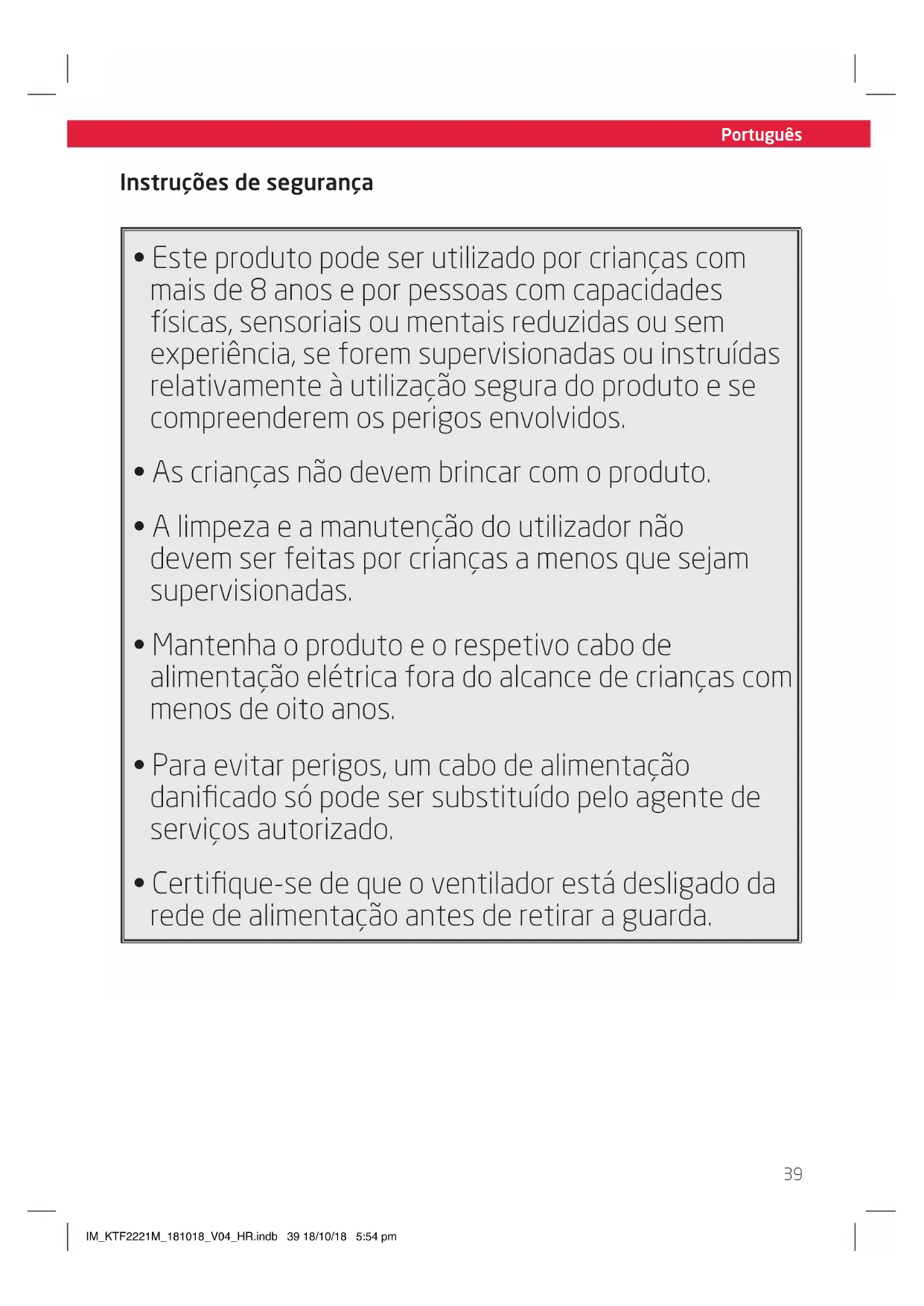 - Certifique-se de que o ventilador está desligado da rede de alimentação antes de retirar a guarda. IM_KTF2221M_181018_V04_HR.indb 39 18/10/18 5:54 pmPortuguês