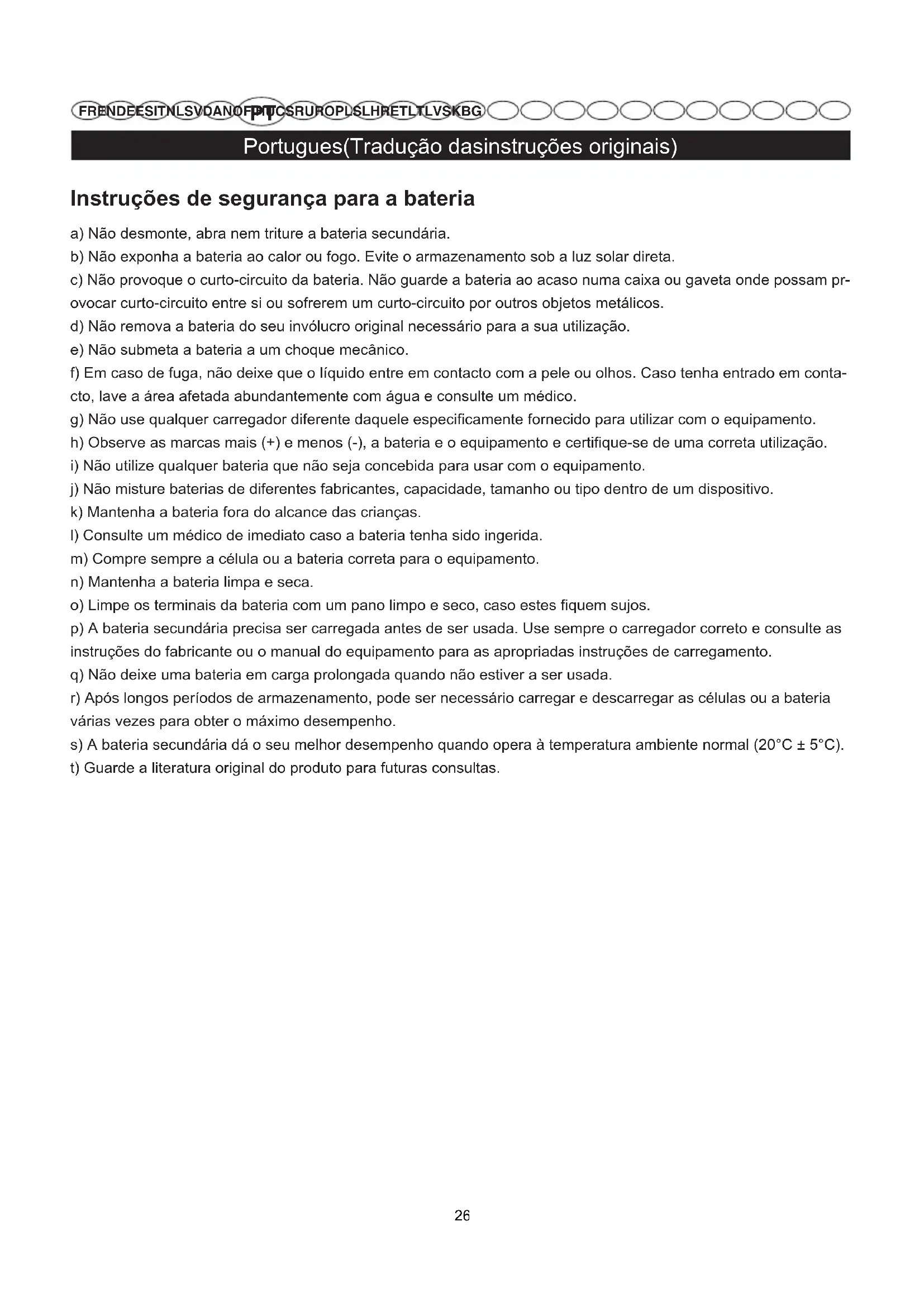 j) Não misture baterias de diferentes fabricantes, capacidade, tamanho ou tipo dentro de um dispositivo. k) Mantenha a bateria fora do alcance das crianças. l) Consulte um médico de imediato caso a bateria tenha sido ingerida. m) Compre sempre a célula ou a bateria correta para o equipamento. n) Mantenha a bateria limpa e seca. o) Limpe os terminais da bateria com um pano limpo e seco, caso estes fiquem sujos. p) A bateria secundária precisa ser carregada antes de ser usada. Use sempre o carregador correto e consulte as instruções do fabricante ou o manual do equipamento para as apropriadas instruções de carregamento. q) Não deixe uma bateria em carga prolongada quando não estiver a ser usada. r) Após longos períodos de armazenamento, pode ser necessário carregar e descarregar as células ou a bateria várias vezes para obter o máximo desempenho. s) A bateria secundária dá o seu melhor desempenho quando opera à temperatura ambiente normal (20°C ± 5°C). t) Guarde a literatura original do produto para futuras consultas.