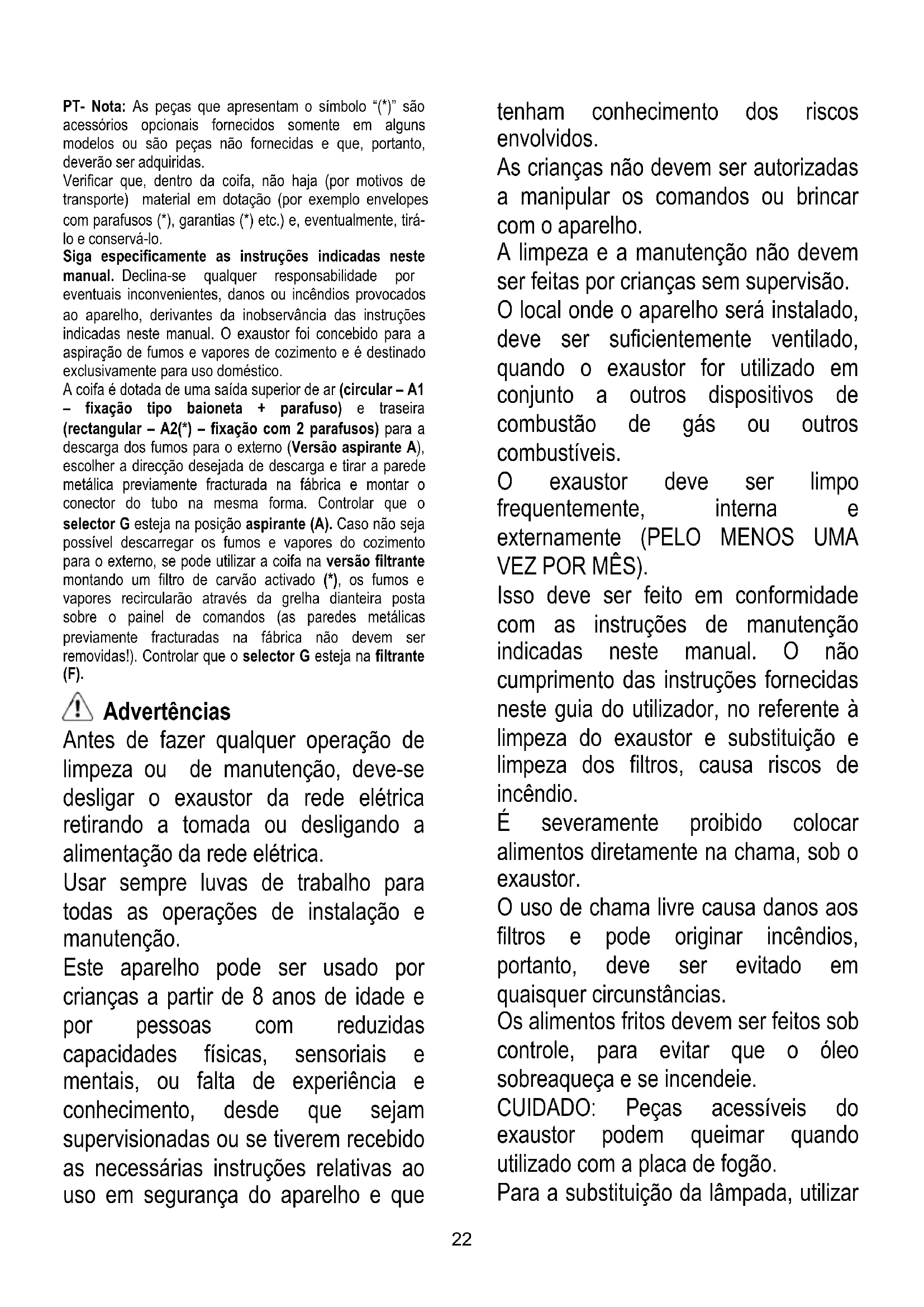 PRODUCTOS QUE CONTENGAN CLORO! Filtro de grasa – Filtro a carbón (*) : es/son montado/dos en el parte posterior de la parrilla y debe/deben ser reemplazado/dos una vez al mes. Si en el modelo que se tiene A es provisto del filtro grasa de metal, este debe ser limpiado una vez por mes con detergentes no agresivos, manualmente o en lavavajillas a bajas temperaturas y en ciclos breves. Con el lavado en lavavajillas el filtro antigrasa de metal, puede perder el color pero sus caracteristicas de filtración no cambian absolutamente. Sustitución de las bombillas (Atención!!! Antes de tocar las bombillas asegurarse que esten frias) :utilizar bombillas max. 40W E14.22 PT- Nota: As peças que apresentam o símbolo “(*)” são acessórios opcionais fornecidos somente em alguns modelos ou são peças não fornecidas e que, portanto, deverão ser adquiridas. Verificar que, dentro da coifa, não haja (por motivos de transporte) material em dotação (por exemplo envelopes com parafusos (*), garantias (*) etc.) e, eventualmente, tirá- lo e conservá-lo. Siga especificamente as instruções indicadas neste manual. Declina-se qualquer responsabilidade por eventuais inconvenientes, danos ou incêndios provocados ao aparelho, derivantes da inobservância das instruções indicadas neste manual. O exaustor foi concebido para a aspiração de fumos e vapores de cozimento e é destinado exclusivamente para uso doméstico. A coifa é dotada de uma saída superior de ar (circular – A1 – fixação tipo baioneta + parafuso) e traseira (rectangular – A2(*) – fixação com 2 parafusos) para a descarga dos fumos para o externo (Versão aspirante A), escolher a direcção desejada de descarga e tirar a parede metálica previamente fracturada na fábrica e montar o conector do tubo na mesma forma. Controlar que o selector G esteja na posição aspirante (A). Caso não seja possível descarregar os fumos e vapores do cozimento para o externo, se pode utilizar a coifa na versão filtrante montando um filtro de carvão activado (*), os fumos e vapores recircularão através da grelha dianteira posta sobre o painel de comandos (as paredes metálicas previamente fracturadas na fábrica não devem ser removidas!). Controlar que o selector G esteja na filtrante (F). Advertências Antes de fazer qualquer operação de limpeza ou de manutenção, deve-se desligar o exaustor da rede elétrica retirando a tomada ou desligando a alimentação da rede elétrica. Usar sempre luvas de trabalho para todas as operações de instalação e manutenção. Este aparelho pode ser usado por crianças a partir de 8 anos de idade e por pessoas com reduzidas capacidades físicas, sensoriais e mentais, ou falta de experiência e conhecimento, desde que sejam supervisionadas ou se tiverem recebido as necessárias instruções relativas ao uso em segurança do aparelho e que tenham conhecimento dos riscos envolvidos. As crianças não devem ser autorizadas a manipular os comandos ou brincar com o aparelho. A limpeza e a manutenção não devem ser feitas por crianças sem supervisão. O local onde o aparelho será instalado, deve ser suficientemente ventilado, quando o exaustor for utilizado em conjunto a outros dispositivos de combustão de gás ou outros combustíveis. O exaustor deve ser limpo frequentemente, interna e externamente (PELO MENOS UMA VEZ POR MÊS). Isso deve ser feito em conformidade com as instruções de manutenção indicadas neste manual. O não cumprimento das instruções fornecidas neste guia do utilizador, no referente à limpeza do exaustor e substituição e limpeza dos filtros, causa riscos de incêndio. É severamente proibido colocar alimentos diretamente na chama, sob o exaustor. O uso de chama livre causa danos aos filtros e pode originar incêndios, portanto, deve ser evitado em quaisquer circunstâncias. Os alimentos fritos devem ser feitos sob controle, para evitar que o óleo sobreaqueça e se incendeie. CUIDADO: Peças acessíveis do exaustor podem queimar quando utilizado com a placa de fogão. Para a substituição da lâmpada, utilizar23 apenas o tipo de lâmpada indicado na secção de Manutenção/Substituição de lâmpadas deste manual. ATENÇÃO! Não ligar o aparelho à rede elétrica até que a instalação esteja totalmente concluída. Relativamente às medidas técnicas e de segurança a serem adotadas para a descarga de fumos, é importante respeitar rigorosamente os regulamentos fornecidos pelas autoridades locais. O sistema de condutas desde aparelho não pode ser conectado a outro sistema de ventilação já existente que esteja sendo usado para qualquer outra finalidade, como descarga de fumos de aparelhos a gás ou outros combustíveis. Não utilizar ou deixar o exaustor sem lâmpadas corretamente montadas, devido ao possível risco de choques elétricos. Nunca utilizar o exaustor sem as grades montadas corretamente. O exaustor NUNCA deve ser utilizado como uma superfície de apoio, a menos que não seja especificamente indicado. Usar somente os parafusos de fixação fornecidos com o aparelho, para a instalação, ou, se não for fornecido, comprar o tipo de parafuso correto. Usar o comprimento correto para os parafusos que são identificados no Guia de Instalação. Em caso de dúvida, consultar um centro de assistência autorizado ou pessoa qualificada similar. ATENÇÃO! A falta de instalação de parafusos ou dispositivos de fixação em conformidade com estas instruções, pode resultar em riscos elétricos. Declina-se toda e qualquer responsabilidade por eventuais avarias, danos ou incêndios provocados ao aparelho como resultado da não- observância das instruções contidas neste manual. Este aparelho está classificado de acordo com a Diretiva Europeia 2012/19/EC sobre Resíduos de equipamento elétrico e eletrónico (REEE). Ao garantir a eliminação adequada deste produto, estará a ajudar a evitar potenciais consequências negativas para o ambiente e para a sa