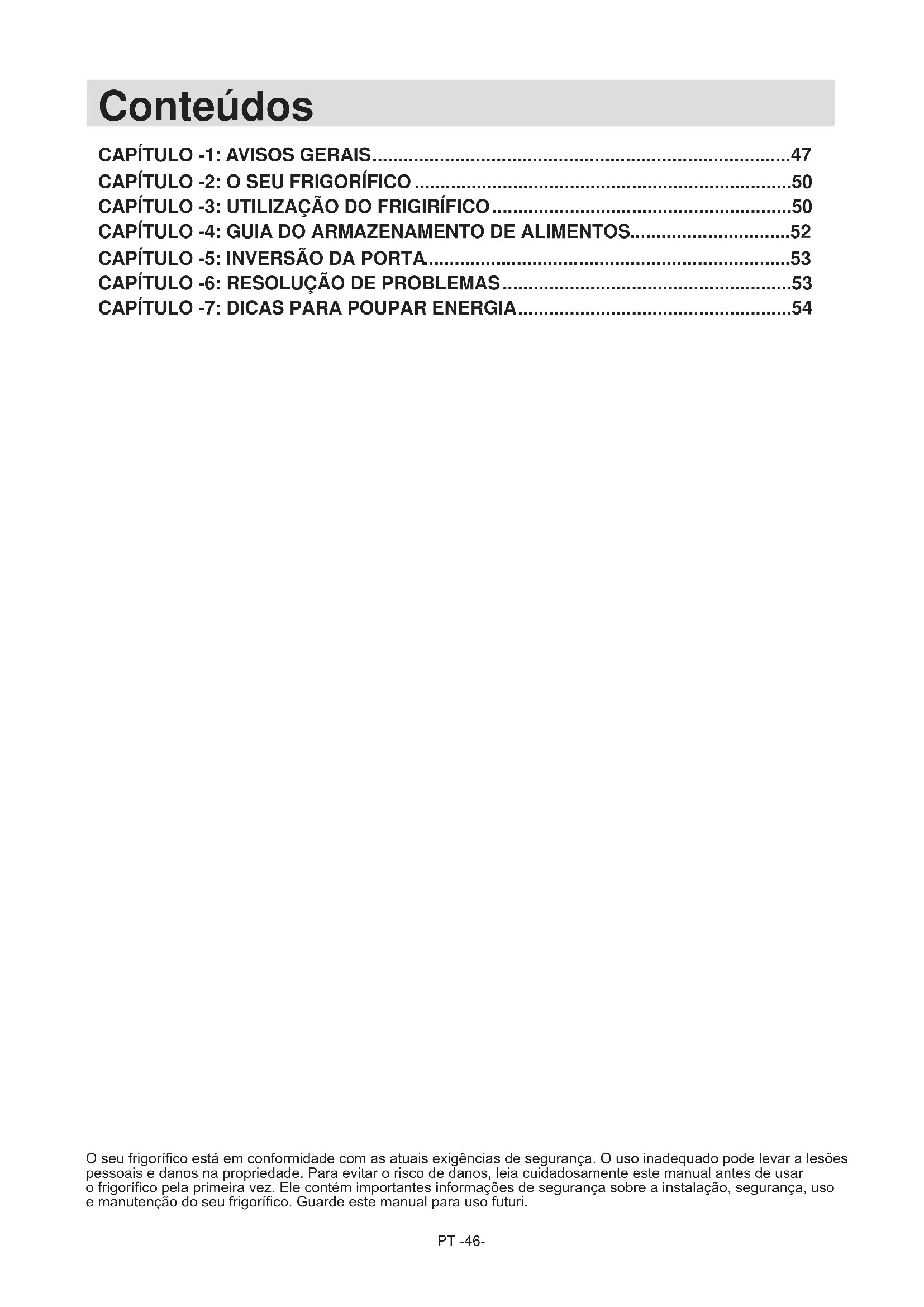 - El electrodoméstico se ha diseñado de conformidad con las normas IEC60335-1 / IEC60335-2-24 y la Directiva 2004/108/CE.PT -46- O seu frigoríco está em conformidade com as atuais exigências de segurança. O uso inadequado pode levar a lesões pessoais e danos na propriedade. Para evitar o risco de danos, leia cuidadosamente este manual antes de usar o frigoríco pela primeira vez. Ele contém importantes informações de segurança sobre a instalação, segurança, uso e manutenção do seu frigoríco. Guarde este manual para uso futuri. Conteúdos