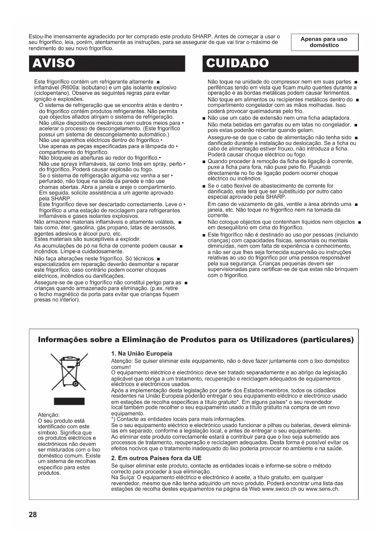 (B246)-W.indb 27 2011/08/30 22:05:3328 Apenas para uso doméstico Estou-lhe imensamente agradecido por ter comprado este produto SHARP. Antes de começar a usar o seu frigoríco, leia, porém, atentamente as instruções, para se assegurar de que vai tirar o máximo de rendimento do seu novo frigoríco. Este frigoríco contém um refrigerante altamente ■ inamável (R600a: isobutano) e um gás isolante explosivo (ciclopentano). Observe as seguintes regras para evitar ignição e explosões. O sistema de refrigeração que se encontra atrás e dentro • do frigoríco contém produtos refrigerantes. Não permita que objectos aados atinjam o sistema de refrigeração. Não utilize dispositivos mecânicos nem outros meios para • acelerar o processo de descongelamento. (Este frigoríco possui um sistema de descongelamento automático.) Não use aparelhos eléctricos dentro do frigoríco.• Use apenas as peças especicadas para a lâmpada do • compartimento do frigoríco. Não bloqueie as aberturas ao redor do frigoríco.• Não use sprays inamáveis, tal como tinta em spray, perto • do frigoríco. Poderá causar explosão ou fogo. Se o sistema de refrigeração alguma vez venha a ser • perfurado, não toque na saída da parede e não use chamas abertas. Abra a janela e areje o compartimento. Em seguida, solicite assistência a um agente aprovado pela SHARP. Este frigoríco deve ser descartado correctamente. Leve o • frigoríco a uma estação de reciclagem para refrigerantes inamáveis e gases isolantes explosivos. Não armazene materiais inamáveis e altamente voláteis, ■ tais como, éter, gasolina, gás propano, latas de aerossóis, agentes adesivos e álcool puro, etc. Estes materiais são susceptíveis a explodir. As acumulações de pó na cha de corrente podem causar ■ incêndios. Limpe-a cuidadosamente. Não faça alterações neste frigoríco. Só técnicos ■ especializados em reparação deverão desmontar e reparar este frigoríco, caso contrário podem ocorrer choques eléctricos, incêndios ou danicações. Assegure-se de que o frigoríco não constitui perigo para as ■ crianças quando armazenado para eliminação. (p.ex. retire o fecho magnético da porta para evitar que crianças quem presas no interior). AVISO CUIDADO Não toque na unidade do compressor nem em suas partes ■ periféricas tendo em vista que cam muito quentes durante a operação e as bordas metálicas podem causar ferimentos. Não toque em alimentos ou recipientes metálicos dentro do ■ compartimento congelador com as mãos molhadas. Isso poderá provocar queimaduras pelo frio. Não use um cabo de extensão nem uma cha adaptadora. ■ Não meta bebidas em garrafas ou em latas no congelador, ■ pois estas poderão rebentar quando gelam. Assegure-se de que o cabo de alimentação não tenha sido ■ danicado durante a instalação ou deslocação. Se a cha ou cabo de alimentação estiver frouxo, não introduza a cha. Poderá causar choque eléctrico ou fogo. Quando proceder à remoção da cha de ligação à corrente, ■ puxe a cha para fora, não puxe pelo o. Puxando directamente no o de ligação podem ocorrer choque eléctrico ou incêndios. Se o cabo exível de abastecimento de corrente for ■ danicado, este terá que ser substituído por outro cabo especial aprovado pela SHARP. Em caso de vazamento de gás, ventile a área abrindo uma ■ janela, etc. Não toque no frigoríco nem na tomada da corrente. Não coloque objectos que contenham líquidos nem objectos ■ em desequilíbrio em cima do frigoríco. Este frigoríco não é destinado ao uso por pessoas (incluindo ■ crianças) com capacidades físicas, sensoriais ou mentais diminuídas, nem com falta de experiência e conhecimento, a não ser que lhes seja fornecida supervisão ou instruções relativas ao uso do frigorico por uma pessoa responsável pela sua segurança. Crianças pequenas devem ser supervisionadas para certicar-se de que estas não brinquem com o frigoríco. Informações sobre a Eliminação de Produtos para os Utilizadores (particulares)