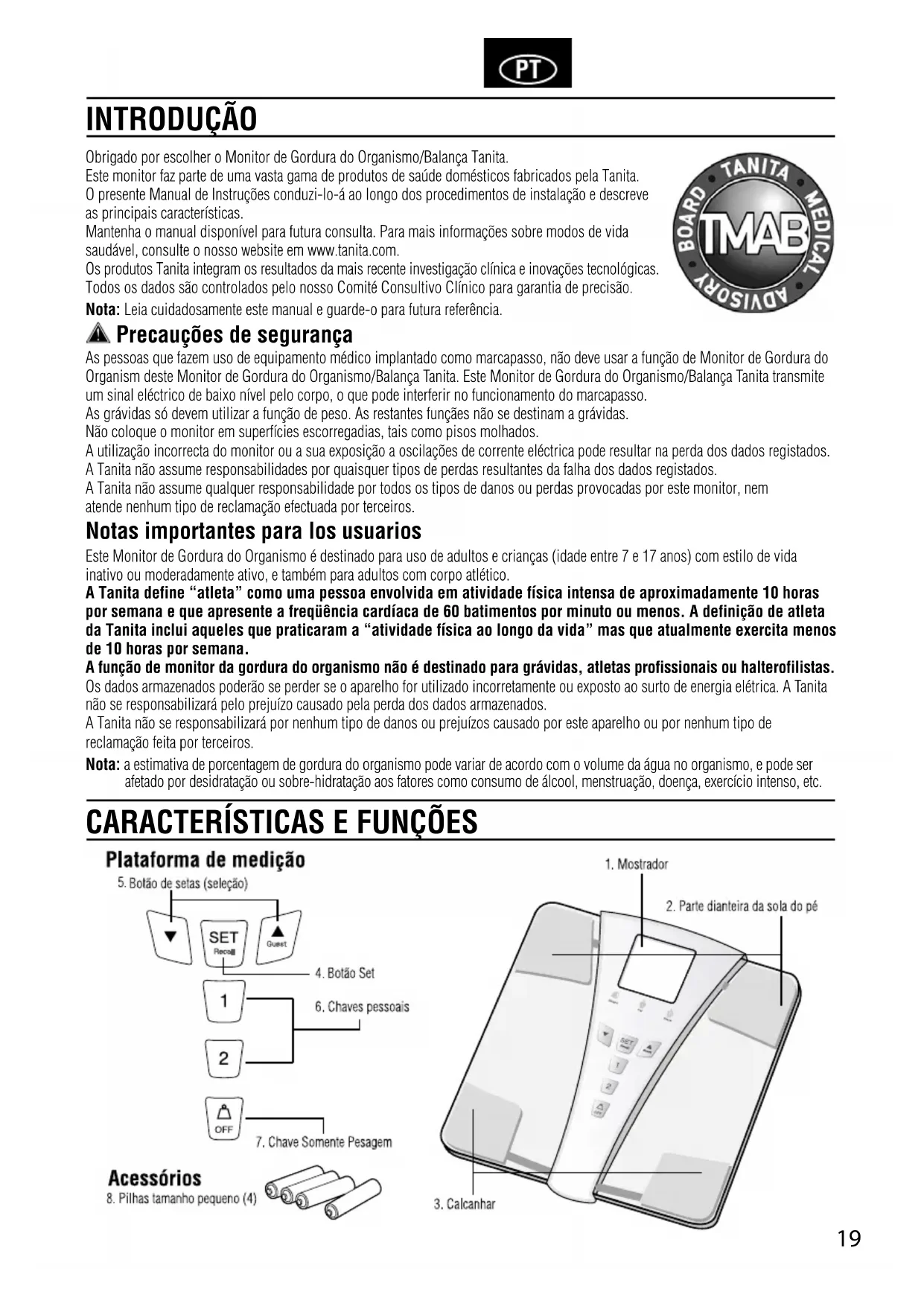 - Consulteconelvendedoroconuntécnicoconexperienciaen radio o televisión, para que le proporcione ayuda. Modificaciones La FCC requiere que se notifique al usuario que cualquier cambio o modificación que se efectúe a este dispositivo, que no sea aprobado expresamente por Tanita Corporation, podría anular la autoridad del usuario para operar este equipo.19 Obrigado por escolher o Monitor de Gordura do Organismo/Balança Tanita. Este monitor faz parte de uma vasta gama de produtos de saúde domésticos fabricados pela Tanita. O presente Manual de Instruções conduzi-lo-á ao longo dos procedimentos de instalação e descreve as principais características. Mantenha o manual disponível para futura consulta. Para mais informações sobre modos de vida saudável, consulte o nosso website em www.tanita.com. Os produtos Tanita integram os resultados da mais recente investigação clínica e inovações tecnológicas. Todos os dados são controlados pelo nosso Comité Consultivo Clínico para garantia de precisão. Nota: Leia cuidadosamente este manual e guarde-o para futura referência. Precauções de segurança As pessoas que fazem uso de equipamento médico implantado como marcapasso, não deve usar a função de Monitor de Gordura do Organism deste Monitor de Gordura do Organismo/Balança Tanita. Este Monitor de Gordura do Organismo/Balança Tanita transmite um sinal eléctrico de baixo nível pelo corpo, o que pode interferir no funcionamento do marcapasso. As grávidas só devem utilizar a função de peso. As restantes funçães não se destinam a grávidas. Nãocoloqueomonitoremsuperfíciesescorregadias,taiscomopisosmolhados. A utilização incorrecta do monitor ou a sua exposição a oscilações de corrente eléctrica pode resultar na perda dos dados registados. A Tanita não assume responsabilidades por quaisquer tipos de perdas resultantes da falha dos dados registados. A Tanita não assume qualquer responsabilidade por todos os tipos de danos ou perdas provocadas por este monitor, nem atende nenhum tipo de reclamação efectuada por terceiros. Notas importantes para los usuarios Este Monitor de Gordura do Organismo é destinado para uso de adultos e crianças (idade entre 7 e 17 anos) com estilo de vida inativo ou moderadamente ativo, e também para adultos com corpo atlético. A Tanita define “atleta” como uma pessoa envolvida em atividade física intensa de aproximadamente 10 horas por semana e que apresente a freqüência cardíaca de 60 batimentos por minuto ou menos. A definição de atleta da Tanita inclui aqueles que praticaram a “atividade física ao longo da vida” mas que atualmente exercita menos de 10 horas por semana. A função de monitor da gordura do organismo não é destinado para grávidas, atletas profissionais ou halterofilistas. Os dados armazenados poderão se perder se o aparelho for utilizado incorretamente ou exposto ao surto de energia elétrica. A Tanita nãoseresponsabilizarápeloprejuízocausadopelaperdadosdadosarmazenados. ATanitanãoseresponsabilizarápornenhumtipodedanosouprejuízoscausadoporesteaparelhooupornenhumtipode reclamação feita por terceiros. Nota: a estimativa de porcentagem de gordura do organismo pode variar de acordo com o volume da água no organismo, e pode ser afetado por desidratação ou sobre-hidratação aos fatores como consumo de álcool, menstruação, doença, exercício intenso, etc. INTRODUÇÃO