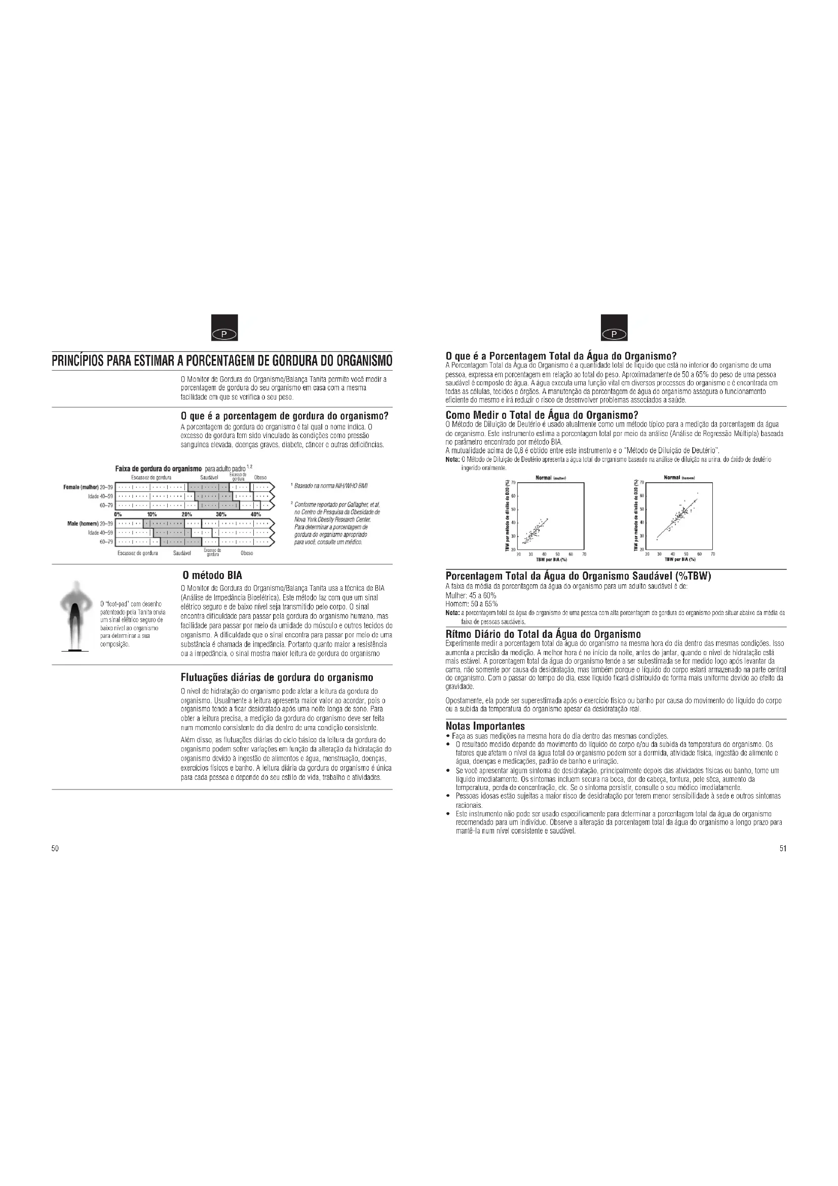 - Este instrumento não pode ser usado especificamente para determinar a porcentagem total da água do organismo recomendado para um indivíduo. Observe a alteração da porcentagem total da água do organismo a longo prazo para mantê-la num nível consistente e saudável.