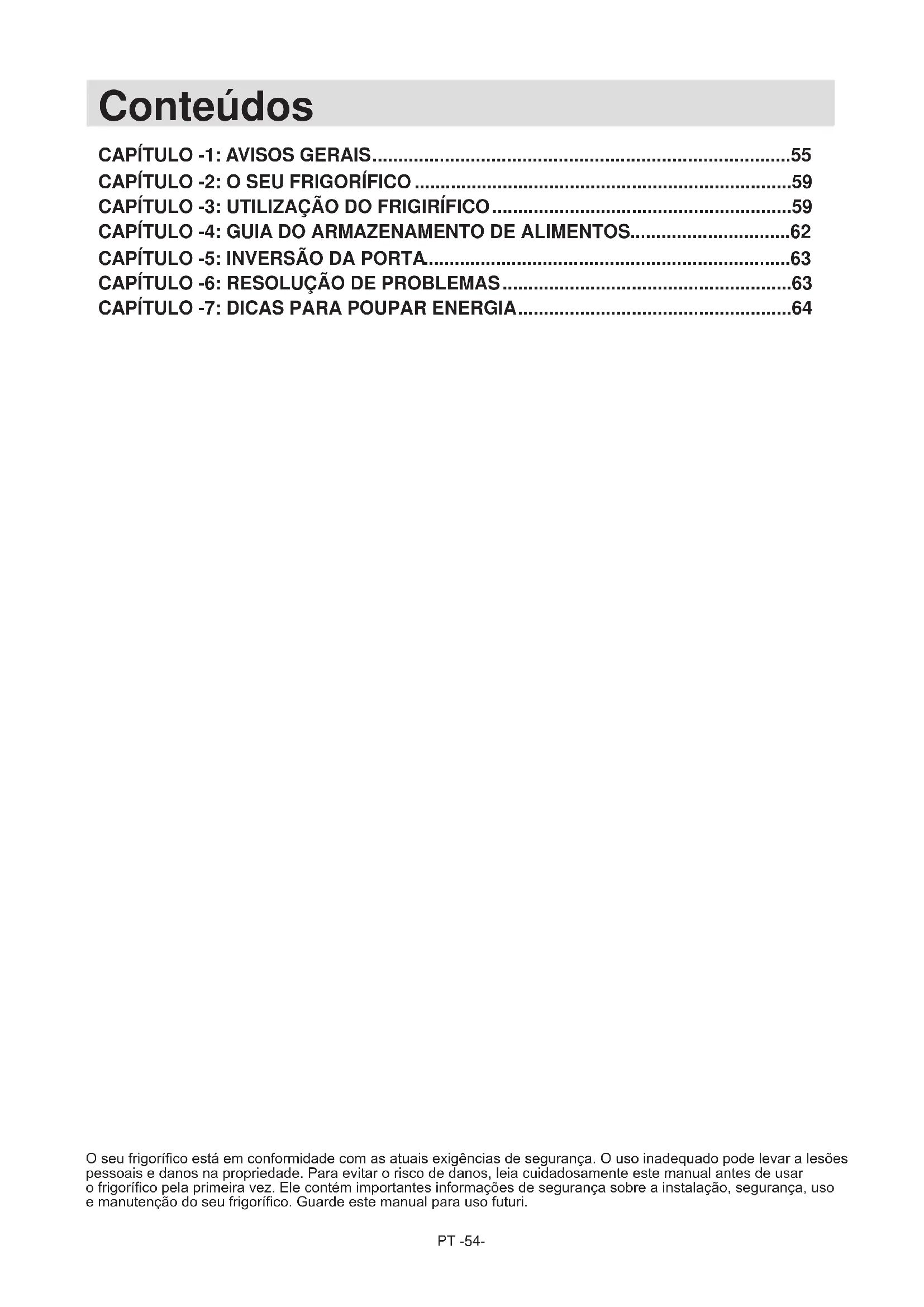 CAPÍTULO 7: SUGERENCIAS PARA AHORRAR ENERGÍAPT -54- O seu frigoríco está em conformidade com as atuais exigências de segurança. O uso inadequado pode levar a lesões pessoais e danos na propriedade. Para evitar o risco de danos, leia cuidadosamente este manual antes de usar o frigoríco pela primeira vez. Ele contém importantes informações de segurança sobre a instalação, segurança, uso e manutenção do seu frigoríco. Guarde este manual para uso futuri. Conteúdos