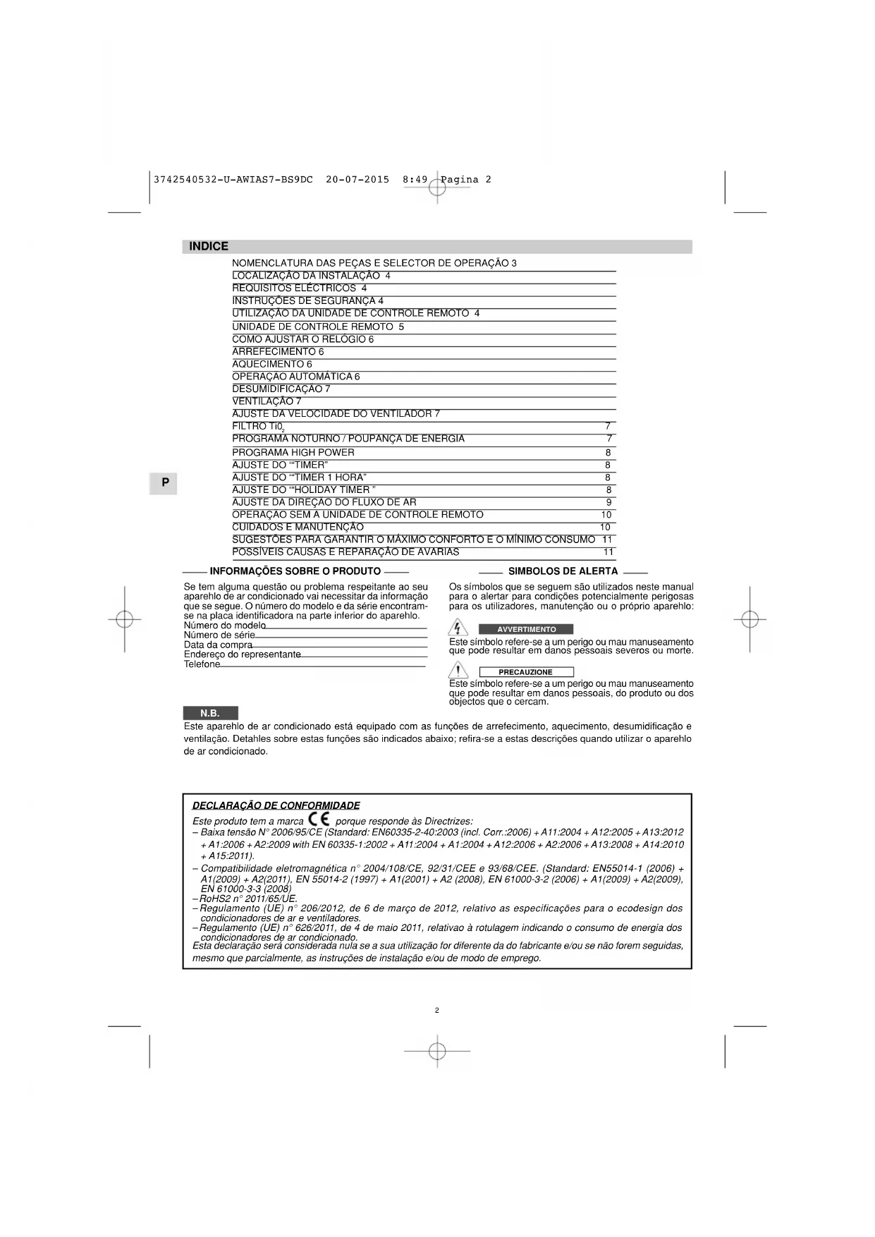 Este produto tem a marca porque responde às Directrizes: – Baixa tensão N° 2006/95/CE (Standard: EN60335-2-40:2003 (incl. Corr.:2006) + A11:2004 + A12:2005 + A13:2012 + A1:2006 + A2:2009 with EN 60335-1:2002 + A11:2004 + A1:2004 + A12:2006 + A2:2006 + A13:2008 + A14:2010 + A15:2011). – Compatibilidade eletromagnética n° 2004/108/CE, 92/31/CEE e 93/68/CEE. (Standard: EN55014-1 (2006) + A1(2009) + A2(2011), EN 55014-2 (1997) + A1(2001) + A2 (2008), EN 61000-3-2 (2006) + A1(2009) + A2(2009), EN 61000-3-3 (2008) – RoHS2 n° 2011/65/UE. –Regulamento (UE) n° 206/2012, de 6 de março de 2012, relativo as especificações para o ecodesign dos condicionadores de ar e ventiladores. – Regulamento (UE) n° 626/2011, de 4 de maio 2011, relativao à rotulagem indicando o consumo de energia dos condicionadores de ar condicionado. Esta declaração será considerada nula se a sua utilização for diferente da do fabricante e/ou se não forem seguidas, mesmo que parcialmente, as instruções de instalação e/ou de modo de emprego. 3742540532-U-AWIAS7-BS9DC 20-07-2015 8:49 Pagina 2P