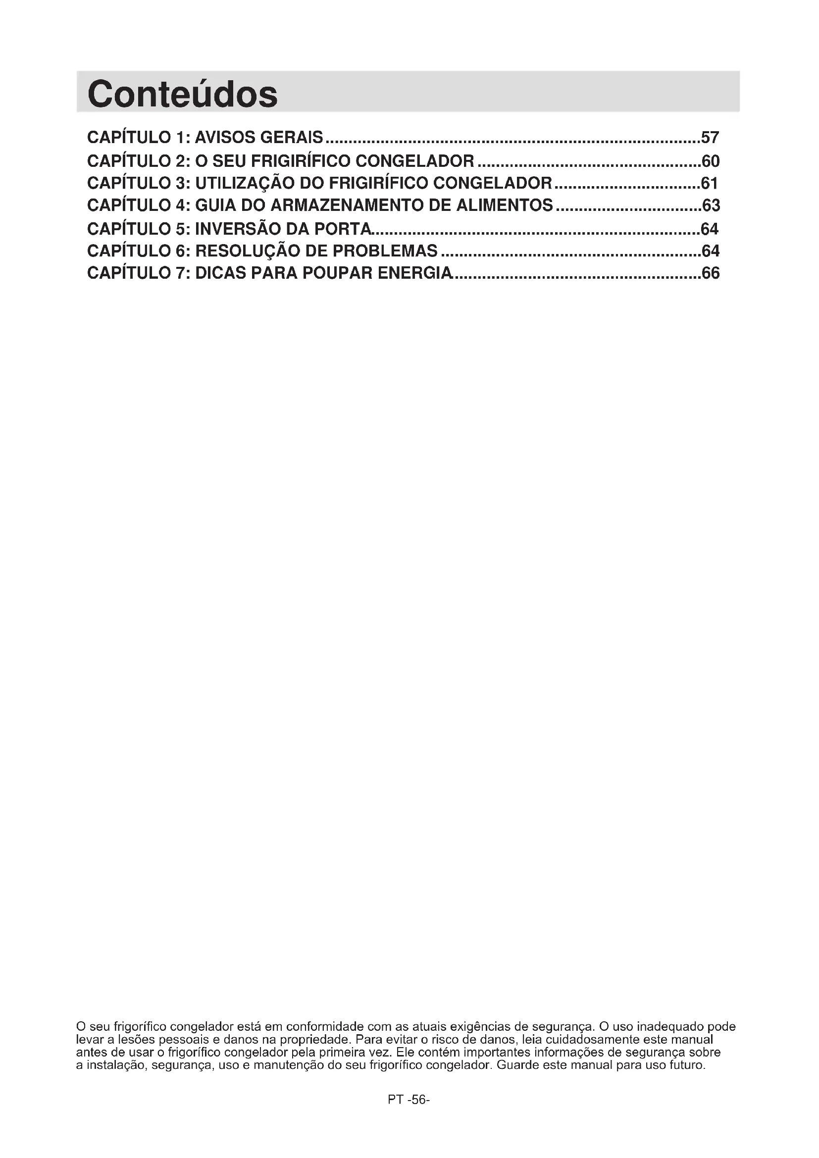 O seu frigoríco congelador está em conformidade com as atuais exigências de segurança. O uso inadequado pode levar a lesões pessoais e danos na propriedade. Para evitar o risco de danos, leia cuidadosamente este manual antes de usar o frigoríco congelador pela primeira vez. Ele contém importantes informações de segurança sobre a instalação, segurança, uso e manutenção do seu frigoríco congelador. Guarde este manual para uso futuro. Conteúdos
