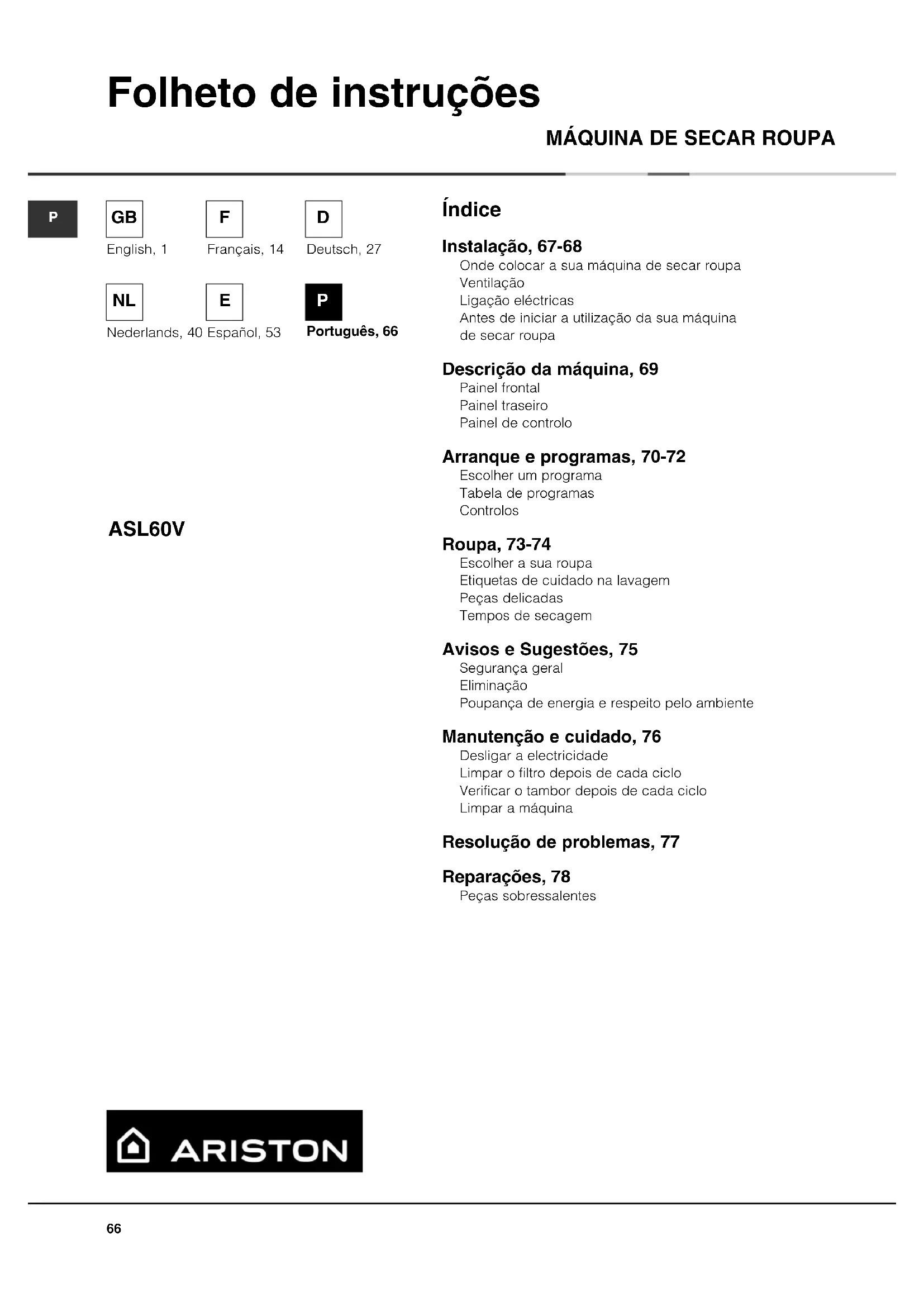 ASL 60 V - Secadora Ariston Thermo - Manual de utilização gratuito