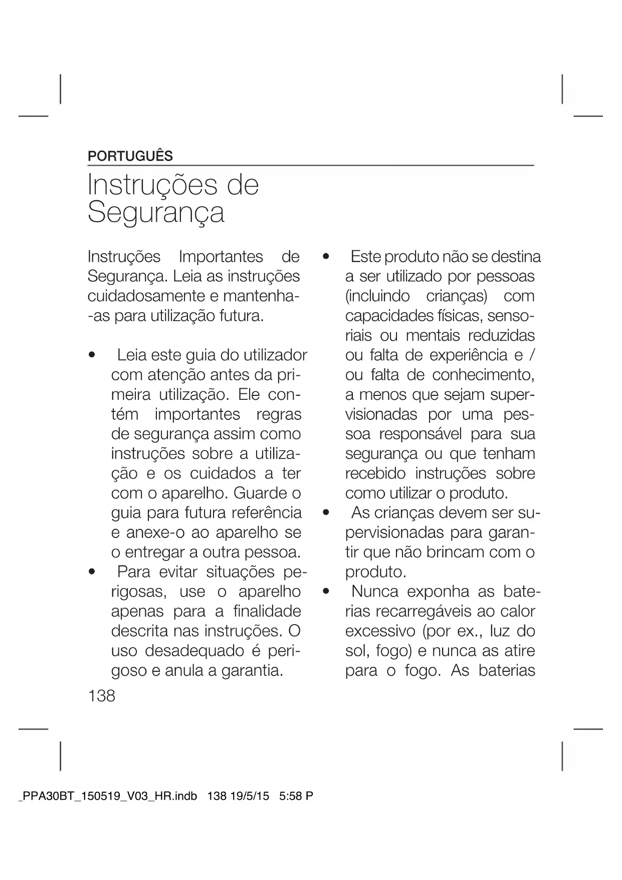 - Nunca exponha as bate- rias recarregáveis ao calor excessivo (por ex., luz do sol, fogo) e nunca as atire para o fogo. As baterias IM_PPA30BT_150519_V03_HR.indb 138 19/5/15 5:58 PMPORTUGUÊS