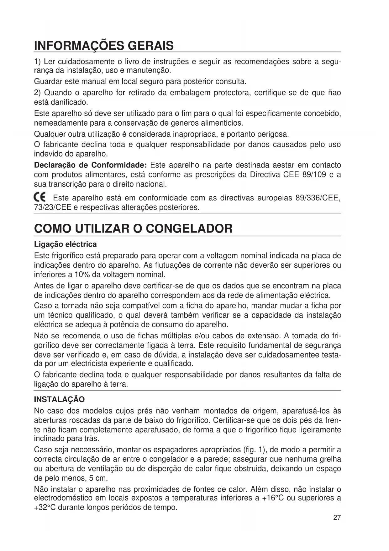 Ligação eléctrica Este frigorífico está preparado para operar com a voltagem nominal indicada na placa de indicações dentro do aparelho. As flutuações de corrente não deverão ser superiores ou inferiores a 10% da voltagem nominal. Antes de ligar o aparelho deve certificar-se de que os dados que se encontram na placa de indicações dentro do aparelho correspondem aos da rede de alimentação eléctrica. Caso a tornada não seja compatível com a ficha do aparelho, mandar mudar a ficha por um técnico qualificado, o qual deverá também verificar se a capacidade da instalação eléctrica se adequa à potência de consumo do aparelho. Não se recomenda o uso de fichas múltiplas e/ou cabos de extensão. A tomada do fri- gorífico deve ser correctamente figada à terra. Este requisito fundamental de segurança deve ser verificado e, em caso de dúvida, a instalação deve ser cuidadosamentee testa- da por um electricista experiente e qualificado. O fabricante declina toda e qualquer responsabilidade por danos resultantes da falta de ligação do aparelho à terra. INSTALAÇÃO No caso dos modelos cujos prés não venham montados de origem, aparafusá-los às aberturas roscadas da parte de baixo do frigorífico. Certificar-se que os dois pés da fren- te não ficam completamente aparafusado, de forma a que o frigorífico fique ligeiramente inclinado para tràs. Caso seja neccessário, montar os espaçadores apropriados (fig. 1), de modo a permitir a correcta circulação de ar entre o congelador e a parede; assegurar que nenhuma grelha ou abertura de ventilação ou de disperção de calor fique obstruida, deixando un espaço de pelo menos, 5 cm. Não instalar o aparelho nas proximidades de fontes de calor. Além disso, não instalar o electrodoméstico em locais expostos a temperaturas inferiores a +16°C ou superiores a +32°C durante longos periódos de tempo. 27Se o congelador for encastrado sob um armário de parede, ha que deixar um ìntervalo mínimo de 5 cm tanto entre o aparelho e a base desse armário quanto entre o frigorífico e a parede traseira do armário onde estiver a ser encastrado entre a parede do comparti- mento para permitir a livre circulação do ar. Uma instalação incorrecta poderá causar danos a pessoas, animais ou bens materiais, pelos quais o fabricante declina toda e qualquer responsabilidade.