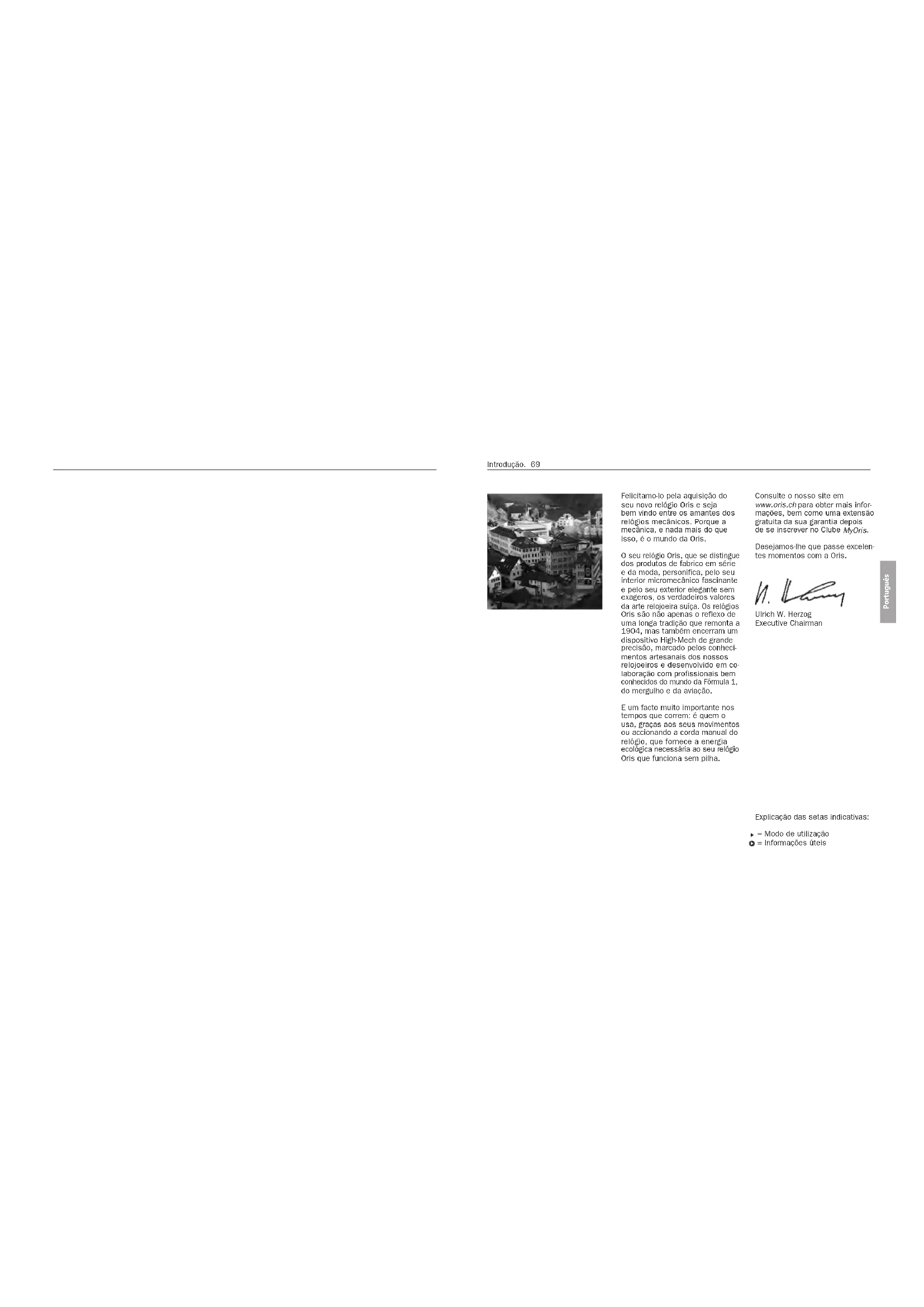 PortuguêsFelicitamo-lo pela aquisição do seu novo relógio Oris e seja bem vindo entre os amantes dos relógios mecânicos. Porque a mecânica, e nada mais do que isso, é o mundo da Oris. O seu relógio Oris, que se distingue dos produtos de fabrico em série e da moda, personifica, pelo seu interior micromecânico fascinante e pelo seu exterior elegante sem exageros, os verdadeiros valores da arte relojoeira suíça. Os relógios Oris são não apenas o reflexo de uma longa tradição que remonta a 1904, mas também encerram um dispositivo High-Mech de grande precisão, marcado pelos conheci- mentos artesanais dos nossos relojoeiros e desenvolvido em co- laboração com profissionais bem conhecidos do mundo da Fórmula 1, do mergulho e da aviação. E um facto muito importante nos tempos que correm: é quem o usa, graças aos seus movimentos ou accionando a corda manual do relógio, que fornece a energia ecológica necessária ao seu relógio Oris que funciona sem pilha. Consulte o nosso site em www.oris.ch para obter mais infor- mações, bem como uma extensão gratuita da sua garantia depois de se inscrever no Clube MyOris