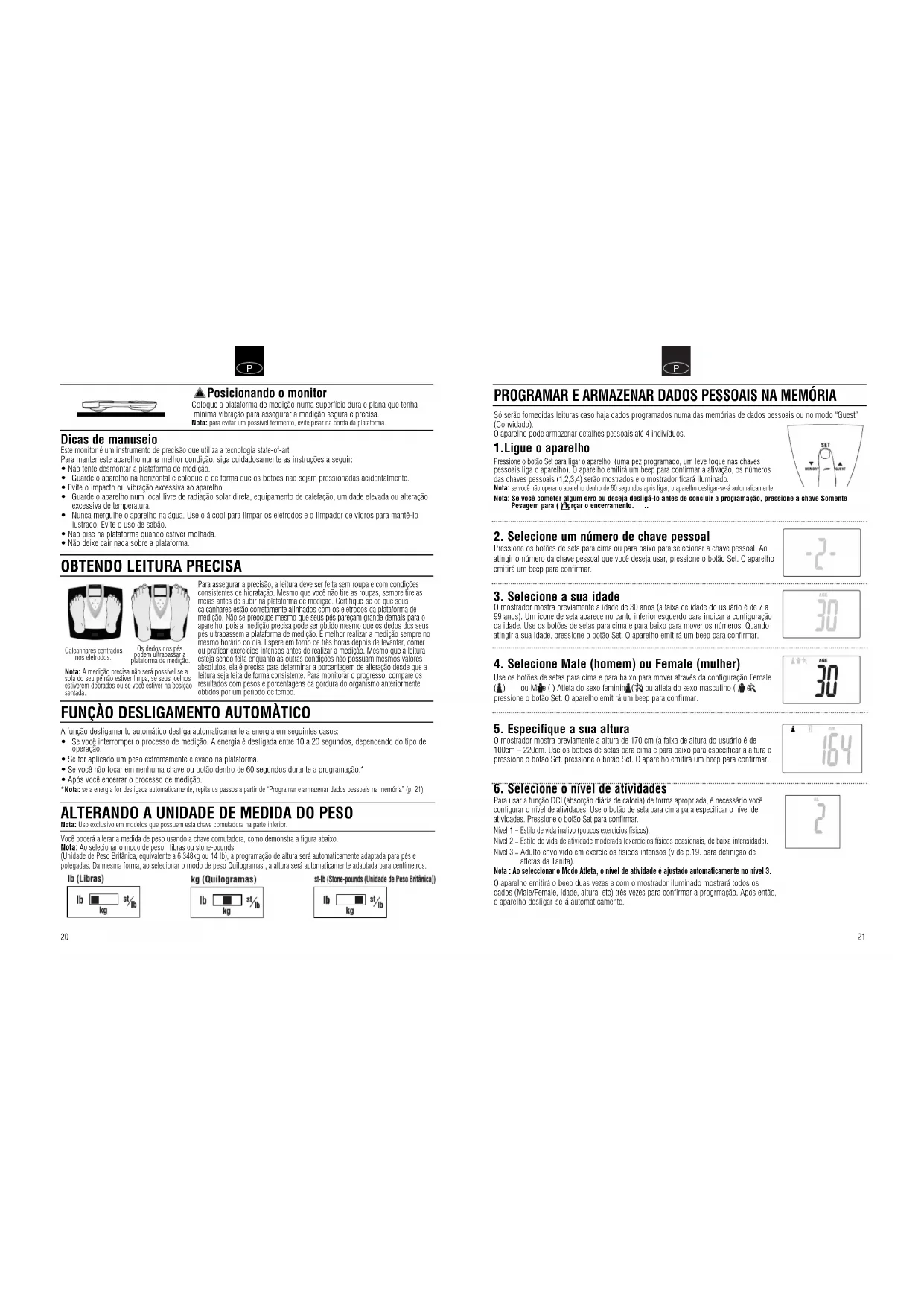 ; depois siga o processo habitual para intro- duzir os dados pessoais. Introduzir: idade, sexo e altura. Nota: se você subir na plataforma antes de aparecer “0.0”, o mostradormostrará “Error” e você não obterá a leitura. Selecione a chave Somente Pesagem Pressione a chave Semente Pesagem. Após 2 a 3 segundos apare- cerá “0.0” no mostrador e o aparelho emitirá um beep. Quando “0.0” aparecer no mostrador, suba na platafomra. Aparecerá o valor do peso do seu corpo. Se você permanecer na plataforma, o mostrador iluminar-se-á aproximadamente por 30 segundos e então o aparelho desligar-se-á automaticamente. Se você subir na plataforma, o peso será mostrado aproximadamente por 5 segun- dos, em seguida aparecerá “0.0” e o aparelho desligar-se-á auto- maticamente.