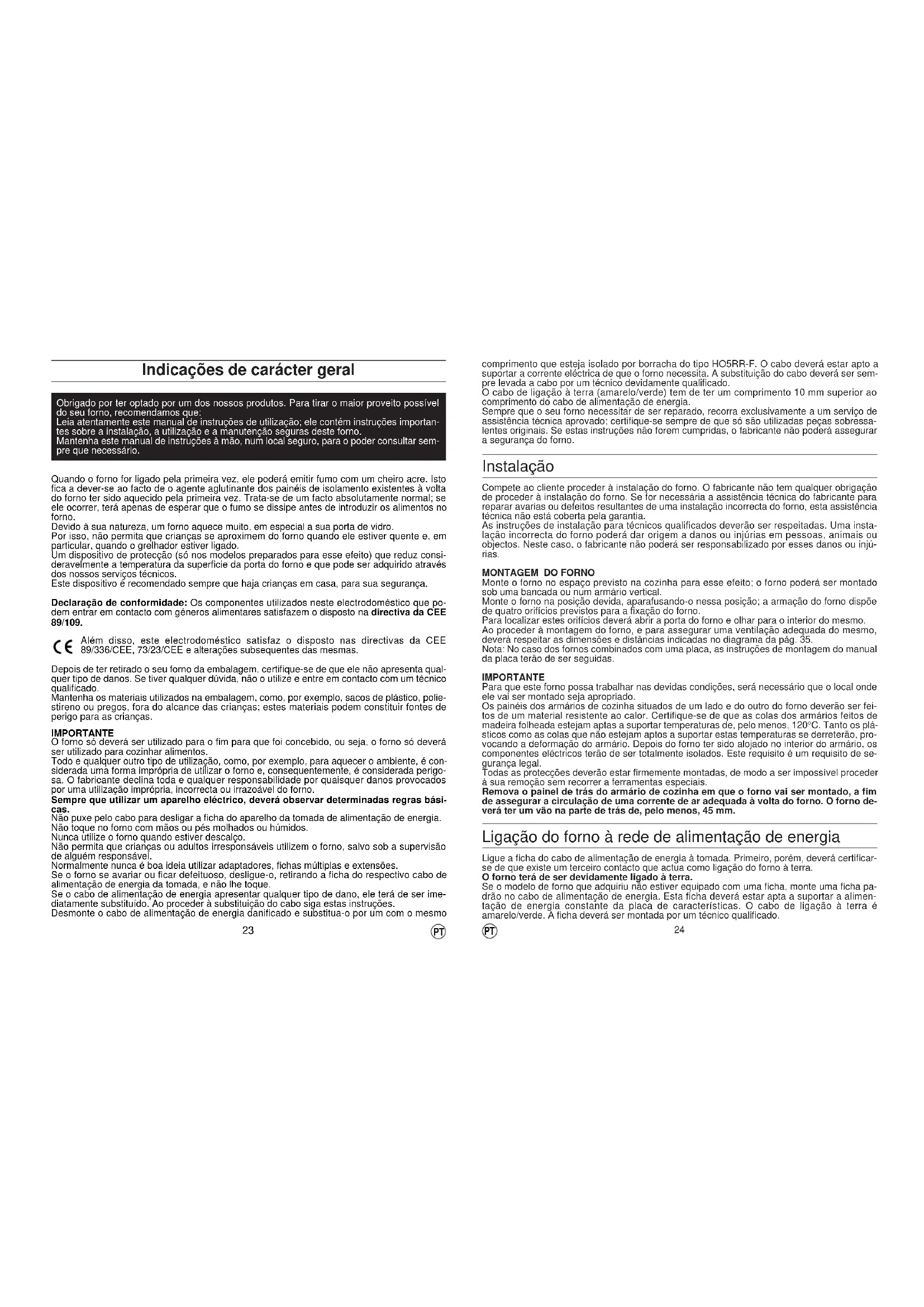 Indicações de carácter geral Obrigado por ter optado por um dos nossos produtos. Para tirar o maior proveito possível do seu forno, recomendamos que: Leia atentamente este manual de instruções de utilização; ele contém instruções importan- tes sobre a instalação, a utilização e a manutenção seguras deste forno. Mantenha este manual de instruções à mão, num local seguro, para o poder consultar sem- pre que necessário. Quando o forno for ligado pela primeira vez, ele poderá emitir fumo com um cheiro acre. Isto fica a dever-se ao facto de o agente aglutinante dos painéis de isolamento existentes à volta do forno ter sido aquecido pela primeira vez. Trata-se de um facto absolutamente normal; se ele ocorrer, terá apenas de esperar que o fumo se dissipe antes de introduzir os alimentos no forno. Devido à sua natureza, um forno aquece muito, em especial a sua porta de vidro. Por isso, não permita que crianças se aproximem do forno quando ele estiver quente e, em particular, quando o grelhador estiver ligado. Um dispositivo de protecção (só nos modelos preparados para esse efeito) que reduz consi- deravelmente a temperatura da superficie da porta do forno e que pode ser adquirido através dos nossos serviços técnicos. Este dispositivo é recomendado sempre que haja crianças em casa, para sua segurança. Declaração de conformidade: Os componentes utilizados neste electrodoméstico que po- dem entrar em contacto com géneros alimentares satisfazem o disposto na directiva da CEE 89/109. Além disso, este electrodoméstico satisfaz o disposto nas directivas da CEE 89/336/CEE, 73/23/CEE e alterações subsequentes das mesmas. Depois de ter retirado o seu forno da embalagem, certifique-se de que ele não apresenta qual- quer tipo de danos. Se tiver qualquer dúvida, não o utilize e entre em contacto com um técnico qualificado. Mantenha os materiais utilizados na embalagem, como, por exemplo, sacos de plástico, polie- stireno ou pregos, fora do alcance das crianças; estes materiais podem constituir fontes de perigo para as crianças. IMPORTANTE O forno só deverá ser utilizado para o fim para que foi concebido, ou seja, o forno só deverá ser utilizado para cozinhar alimentos. Todo e qualquer outro tipo de utilização, como, por exemplo, para aquecer o ambiente, é con- siderada uma forma imprópria de utilizar o forno e, consequentemente, é considerada perigo- sa. O fabricante declina toda e qualquer responsabilidade por quaisquer danos provocados por uma utilização imprópria, incorrecta ou irrazoável do forno. Sempre que utilizar um aparelho eléctrico, deverá observar determinadas regras bási- cas. Não puxe pelo cabo para desligar a ficha do aparelho da tomada de alimentação de energia. Não toque no forno com mãos ou pés molhados ou húmidos. Nunca utilize o forno quando estiver descalço. Não permita que crianças ou adultos irresponsáveis utilizem o forno, salvo sob a supervisão de alguém responsável. Normalmente nunca é boa ideia utilizar adaptadores, fichas múltiplas e extensões. Se o forno se avariar ou ficar defeituoso, desligue-o, retirando a ficha do respectivo cabo de alimentação de energia da tomada, e não lhe toque. Se o cabo de alimentação de energia apresentar qualquer tipo de dano, ele terá de ser ime- diatamente substituído. Ao proceder à substituição do cabo siga estas instruções. Desmonte o cabo de alimentação de energia danificado e substitua-o por um com o mesmo