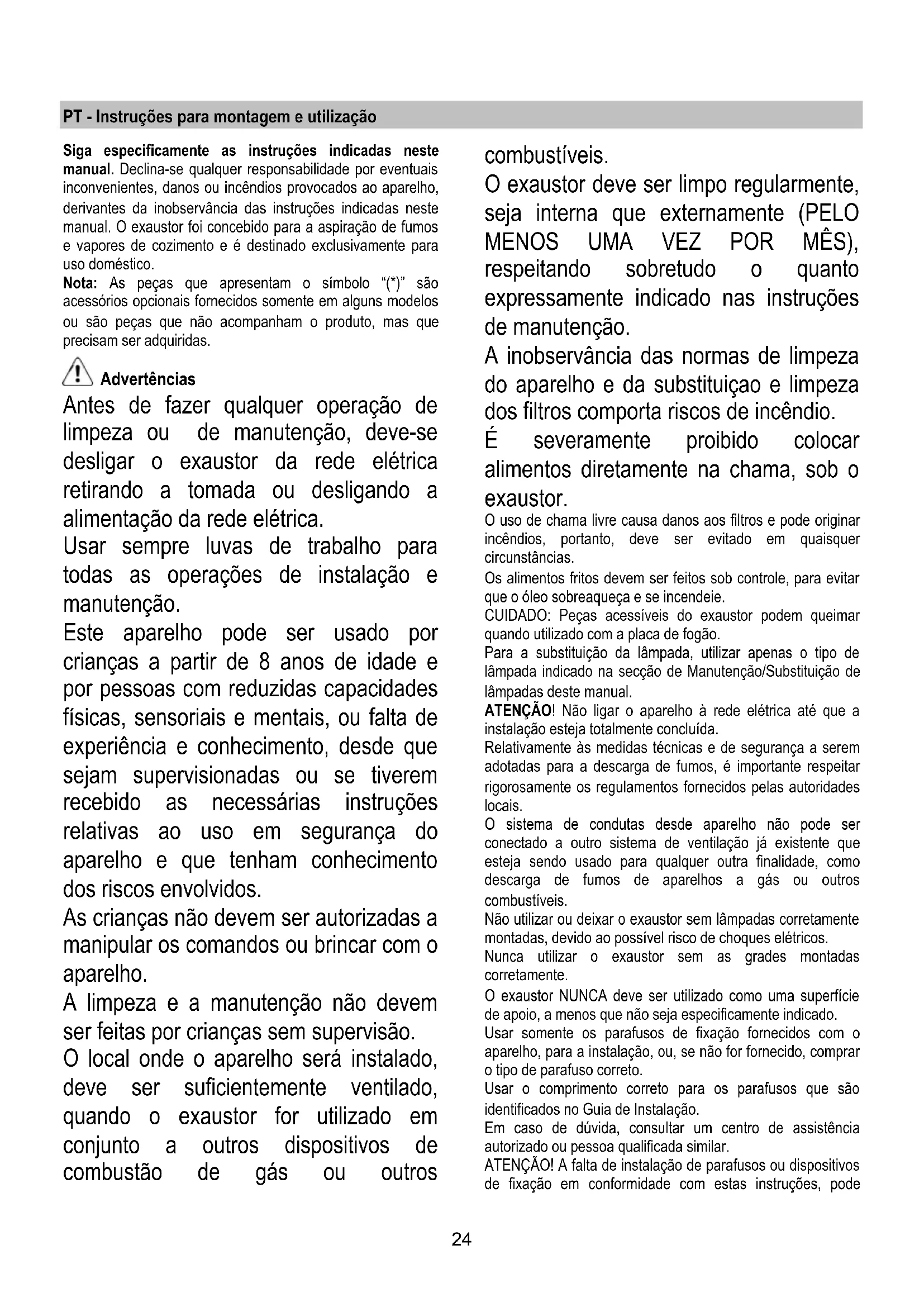 PRODUCTOS QUE CONTENGAN CLORO! Filtro antigrasa Retiene las partículas de grasa producidas cuando se cocina. Si està situado en el interior de una parilla de soporte, puede ser uno de los siguientes tipos: El filtro de papel tiene que ser substituido una vez al mes o si està coloreado en el lado superior, cuando el color transluce por los orificios de la parilla. El filtro metàlico tiene que ser limpiado una vez al mes, con detergentes no agresivos, manualmente o en el lavavajillas a temperaturas bajas y con un ciclo de lavado breve. Con el lavado en el lavavajilla el filtro antigrasa metálico puede desteñirse pero sus características de filtrado no cambian absolutamente. Para acceder al filtro grasas abra la rejilla con los enganches P y sáquelo de los topes R1 y R 2. El filtro metálico autoportante no tiene rejilla para sujetarlo, para sacarlo tire de los muelles de desenganche P4 hacia atrás y saque el filtro hacia abajo. Filtro al carbón activo (solamente para la versión filtrante) Retiene los olores desagradables producidos por la cocción de alimentos. La saturaciòn del carbòn activado ocurre despuès da mas o menos tiempo de uso prolongado, dependiendo del tipo de cocina y de la regularidad de limpieza del filtro de grasa. En cualquier caso es necesario sustituir el cartucho al menos cada 4 meses. NO puede lavarse o reciclarse. Puede ser de diferentes tipos: Rectangular S1 o S2 o S3: Montaje (S1 o S2): introduzca la parte posterior T y engánchela anteriormente (U). Montaje (S3): Quite la tapa W girando 90° los pomos O. Introduzca la esponja de carbón en su sitio y sujétela girando 90° el pomo O, vuelva a cerrar la tapa. Realice esta operación al revés para desmontarla. Circular (V1-V2-V3- varios modelos): Encaje a bayoneta Situar en el centro tapando la rejilla que protege el motor teniendo cuidado de que las referencias X1 X2 X3 en el filtro al carbón correspondan con las referencias Y1 o Y2 en el canalizador, gíre despuès en sentido de las agujas del reloj, si posee una lengueta Z acuérdese de levantarla antes un poco. Sustitución de la lámpara Desconecte el aparato de la red elèctrica. Atención! Antes de tocar las lámparas asegúrese de que esten frías. Sustituir la lámpara dañada con una del mismo tipo como se especifica en la etiqueta correspondiente o en la campana cerca de la lámpara misma . Sustituir la lámpara dañada Utilizar sólo lámparas halógenas con forma a vela Ø35mm E14 28W. Si la iluminación no funciona, antes de llamar al servicio de asistencia técnica, revisar que las lámparas estén correctamente instaladas.24 PT - Instruções para montagem e utilização Siga especificamente as instruções indicadas neste manual. Declina-se qualquer responsabilidade por eventuais inconvenientes, danos ou incêndios provocados ao aparelho, derivantes da inobservância das instruções indicadas neste manual. O exaustor foi concebido para a aspiração de fumos e vapores de cozimento e é destinado exclusivamente para uso doméstico. Nota: As peças que apresentam o símbolo “(*)” são acessórios opcionais fornecidos somente em alguns modelos ou são peças que não acompanham o produto, mas que precisam ser adquiridas. Advertências Antes de fazer qualquer operação de limpeza ou de manutenção, deve-se desligar o exaustor da rede elétrica retirando a tomada ou desligando a alimentação da rede elétrica. Usar sempre luvas de trabalho para todas as operações de instalação e manutenção. Este aparelho pode ser usado por crianças a partir de 8 anos de idade e por pessoas com reduzidas capacidades físicas, sensoriais e mentais, ou falta de experiência e conhecimento, desde que sejam supervisionadas ou se tiverem recebido as necessárias instruções relativas ao uso em segurança do aparelho e que tenham conhecimento dos riscos envolvidos. As crianças não devem ser autorizadas a manipular os comandos ou brincar com o aparelho. A limpeza e a manutenção não devem ser feitas por crianças sem supervisão. O local onde o aparelho será instalado, deve ser suficientemente ventilado, quando o exaustor for utilizado em conjunto a outros dispositivos de combustão de gás ou outros combustíveis. O exaustor deve ser limpo regularmente, seja interna que externamente (PELO MENOS UMA VEZ POR MÊS), respeitando sobretudo o quanto expressamente indicado nas instruções de manutenção. A inobservância das normas de limpeza do aparelho e da substituiçao e limpeza dos filtros comporta riscos de incêndio. É severamente proibido colocar alimentos diretamente na chama, sob o exaustor. O uso de chama livre causa danos aos filtros e pode originar incêndios, portanto, deve ser evitado em quaisquer circunstâncias. Os alimentos fritos devem ser feitos sob controle, para evitar que o óleo sobreaqueça e se incendeie. CUIDADO: Peças acessíveis do exaustor podem queimar quando utilizado com a placa de fogão. Para a substituição da lâmpada, utilizar apenas o tipo de lâmpada indicado na secção de Manutenção/Substituição de lâmpadas deste manual. ATENÇÃO! Não ligar o aparelho à rede elétrica até que a instalação esteja totalmente concluída. Relativamente às medidas técnicas e de segurança a serem adotadas para a descarga de fumos, é importante respeitar rigorosamente os regulamentos fornecidos pelas autoridades locais. O sistema de condutas desde aparelho não pode ser conectado a outro sistema de ventilação já existente que esteja sendo usado para qualquer outra finalidade, como descarga de fumos de aparelhos a gás ou outros combustíveis. Não utilizar ou deixar o exaustor sem lâmpadas corretamente montadas, devido ao possível risco de choques elétricos. Nunca utilizar o exaustor sem as grades montadas corretamente. O exaustor NUNCA deve ser utilizado como uma superfície de apoio, a menos que não seja especificamente indicado. Usar somente os parafusos de fixação fornecidos com o aparelho, para a 