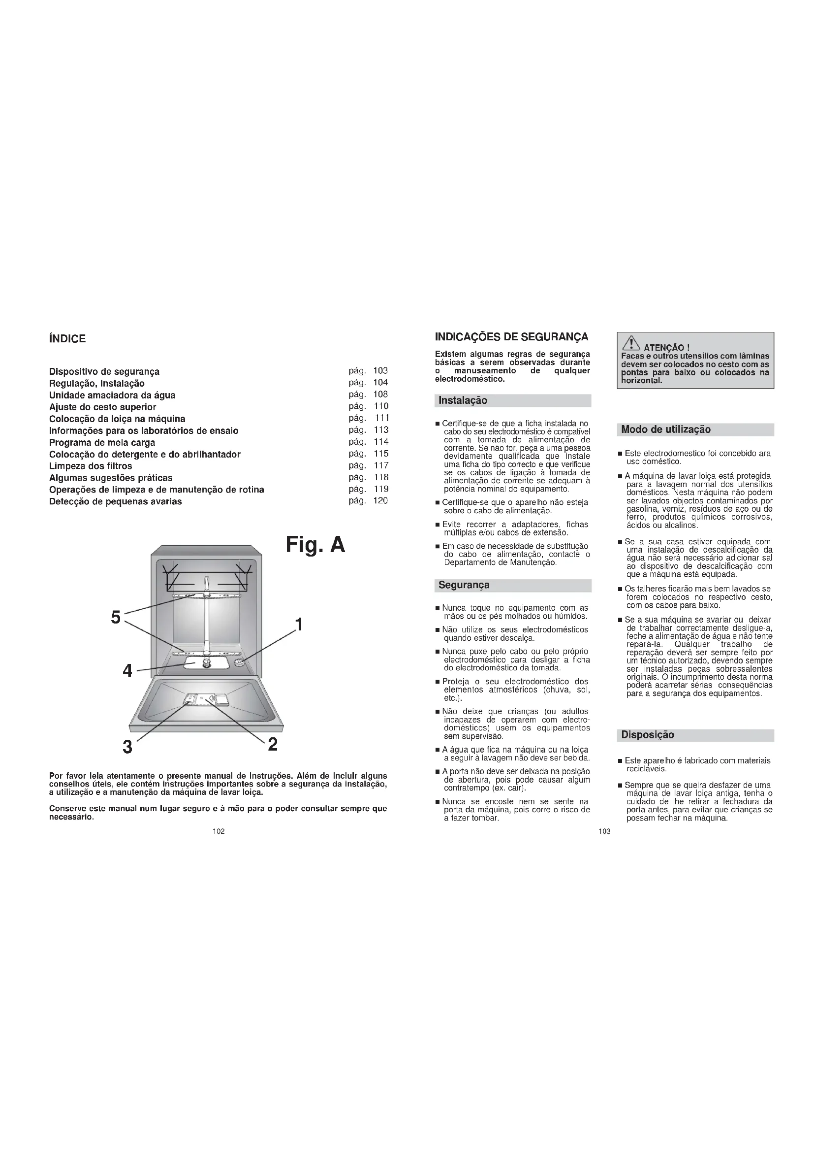 ÍNDICE Dispositivo de segurança Regulação, instalação Unidade amaciadora da água Ajuste do cesto superior Colocação da loiça na máquina Informações para os laboratórios de ensaio Programa de meia carga Colocação do detergente e do abrilhantador Limpeza dos filtros Algumas sugestões práticas Operações de limpeza e de manutenção de rotina Detecção de pequenas avarias Por favor leia atentamente o presente manual de instruções. Além de incluir algunsconselhos úteis, ele contém instruções importantes sobre a segurança da instalação,a utilização e a manutenção da máquina de lavar loiça.Conserve este manual num lugar seguro e à mão para o poder consultar sempre quenecessário. Fig. A