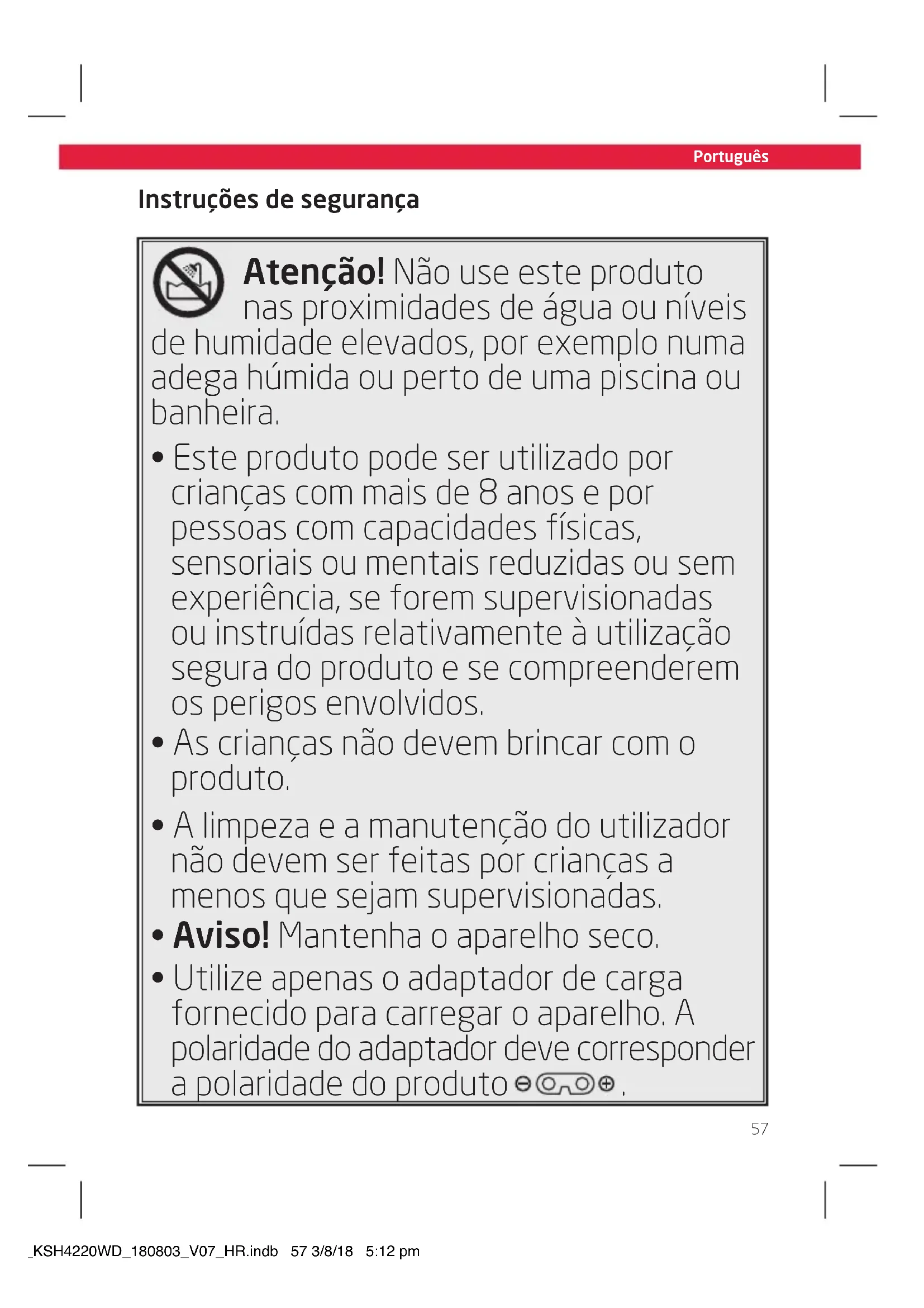 do golarki, jak opisano w rozdziale Czyszczenie i konserwacja . IM_KSH4220WD_180803_V07_HR.indb 56 3/8/18 5:12 pm57 Português Instruções de segurança Atenção! Não use este produto nas proximidades de água ou níveis de humidade elevados, por exemplo numa adega húmida ou perto de uma piscina ou banheira.