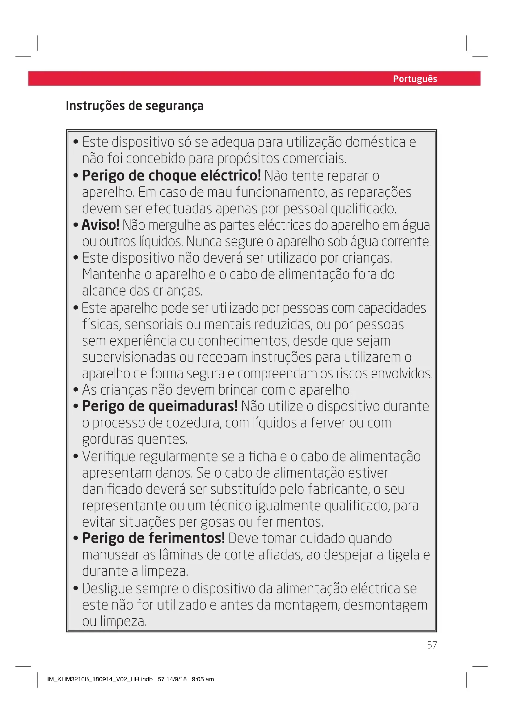 - Desligue sempre o dispositivo da alimentação eléctrica se este não for utilizado e antes da montagem, desmontagem ou limpeza. IM_KHM3210B_180914_V02_HR.indb 57 14/9/18 9:05 am58 Português Size - A5 Instruções de segurança