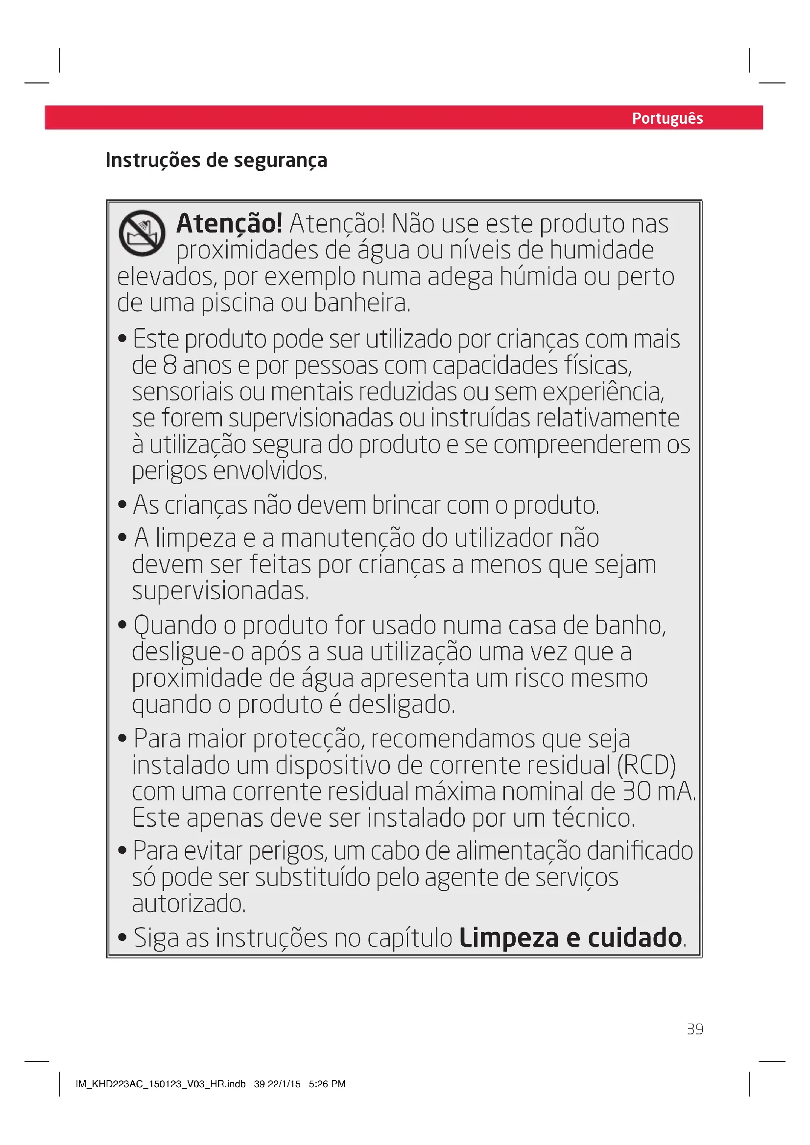 Atença! Atença! Não use este produit nas proximidades de água ou sinais de humidade