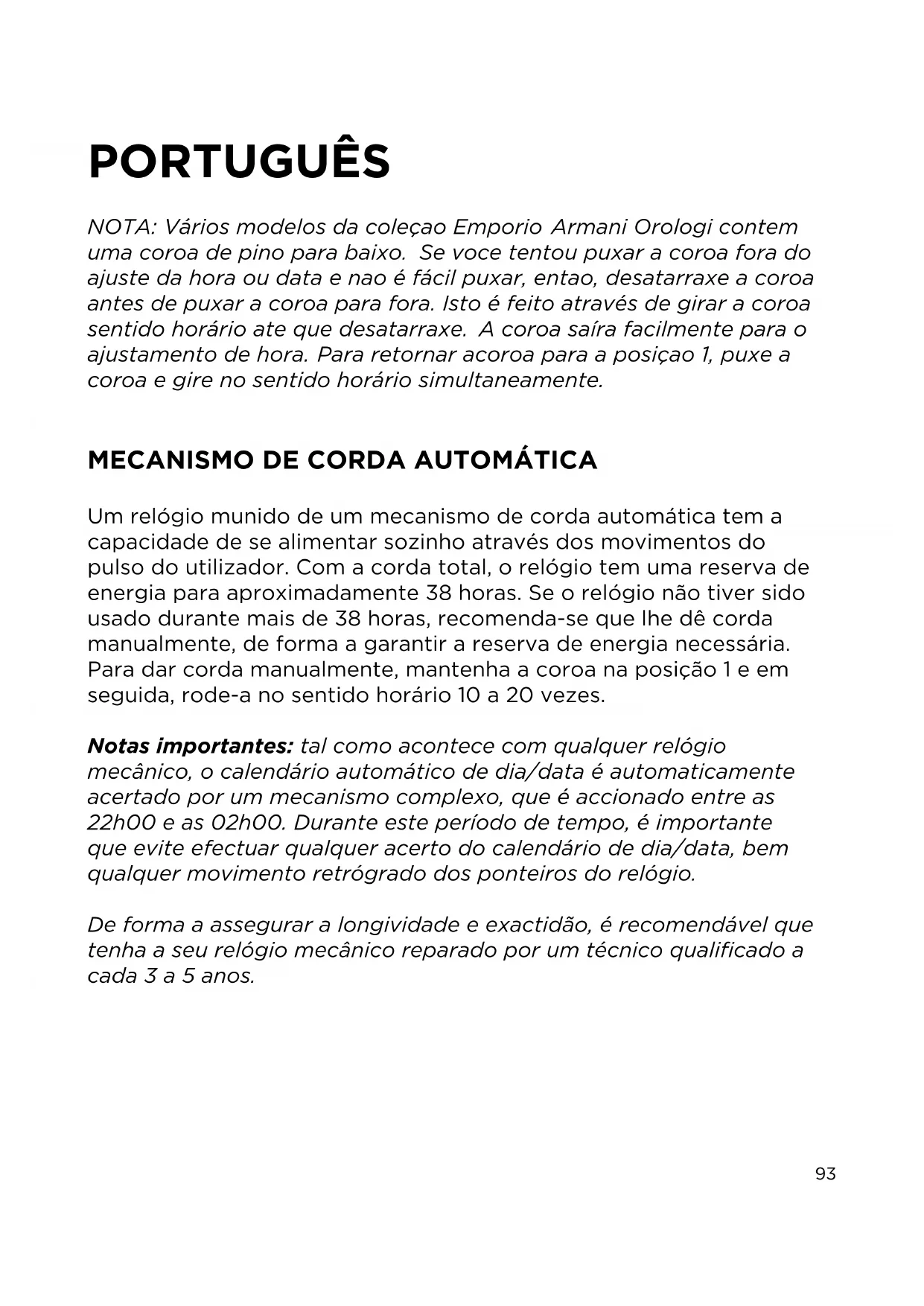 Notas importantes: tal como acontece comrialquer relógio mecánico, o calendário automatico de dia/data é automaticamente acertado por um mecanismo complexo, que é actionado entre as 22h00 e as 02h00. Durante este periodo de tempo, é importante que evite efectuar qualquer acerto do calendário de dia/data, bem qualquer movimento retrógrado dos ponteiros do relógio.