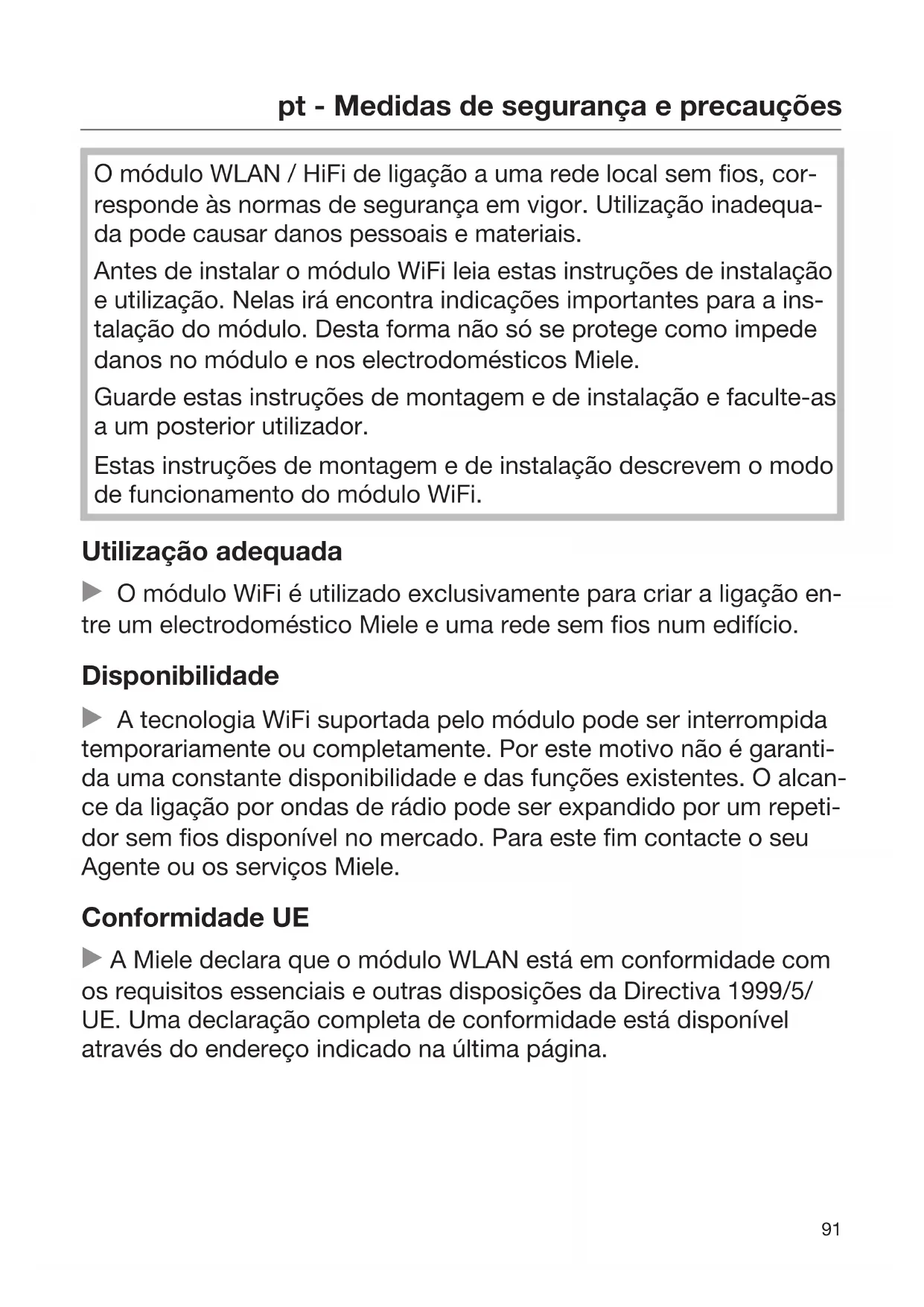 O módulo WLAN / HiFi de ligação a uma rede local sem fios, cor- responde às normas de segurança em vigor. Utilização inadequa- da pode causar danos pessoais e materiais. Antes de instalar o módulo WiFi leia estas instruções de instalação e utilização. Nelas irá encontra indicações importantes para a ins- talação do módulo. Desta forma não só se protege como impede danos no módulo e nos electrodomésticos Miele. Guarde estas instruções de montagem e de instalação e faculte-as a um posterior utilizador. Estas instruções de montagem e de instalação descrevem o modo de funcionamento do módulo WiFi. Utilização adequada O módulo WiFi é utilizado exclusivamente para criar a ligação en- tre um electrodoméstico Miele e uma rede sem fios num edifício. Disponibilidade A tecnologia WiFi suportada pelo módulo pode ser interrompida temporariamente ou completamente. Por este motivo não é garanti- da uma constante disponibilidade e das funções existentes. O alcan- ce da ligação por ondas de rádio pode ser expandido por um repeti- dor sem fios disponível no mercado. Para este fim contacte o seu Agente ou os serviços Miele. Conformidade UE A Miele declara que o módulo WLAN está em conformidade com os requisitos essenciais e outras disposições da Directiva 1999/5/ UE. Uma declaração completa de conformidade está disponível através do endereço indicado na última página.pt - Medidas de segurança e precauções