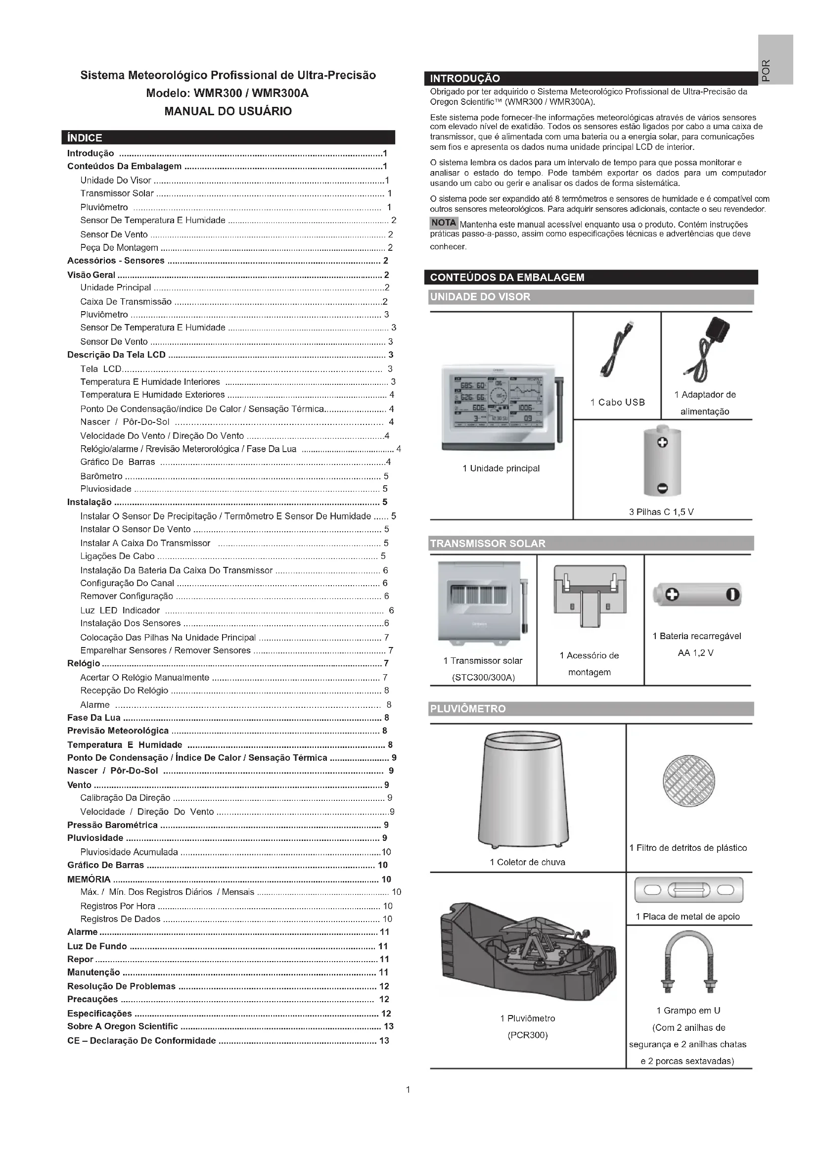 1 Unidade principal 1 C a b o U S B 1 Adaptador de alimentação 3 Pilhas C 1,5 V TRANSMISSOR SOLAR 1 Transmissor solar (STC300/300A) 1 Acessório de montagem 1 Bateria recarregável AA 1,2 V PLUVIôMETRO 1 Coletor de chuva 1 Filtro de detritos de plástico 1 Pluviômetro (PCR300) 1 Placa de metal de apoio 1 Grampo em U (Com 2 anilhas de segurança e 2 anilhas chatas e 2 porcas sextavadas) Sistema Meteorológico Prossional de Ultra-Precisão Modelo: WMR300 / WMR300A