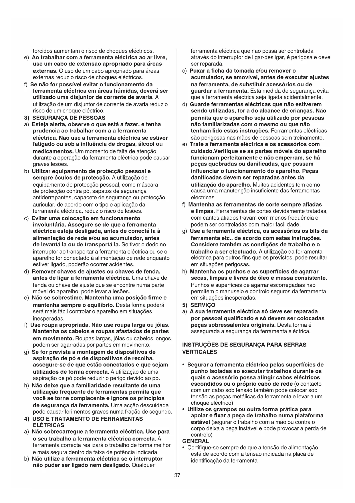 a) A sua ferramenta eléctrica só deve ser reparada por pessoal qualicado e só devem ser colocadas peças sobressalentes originais. Desta forma é assegurada a segurança da ferramenta eléctrica. INSTRUÇÕES DE SEGURANÇA PARA SERRAS VERTICALES