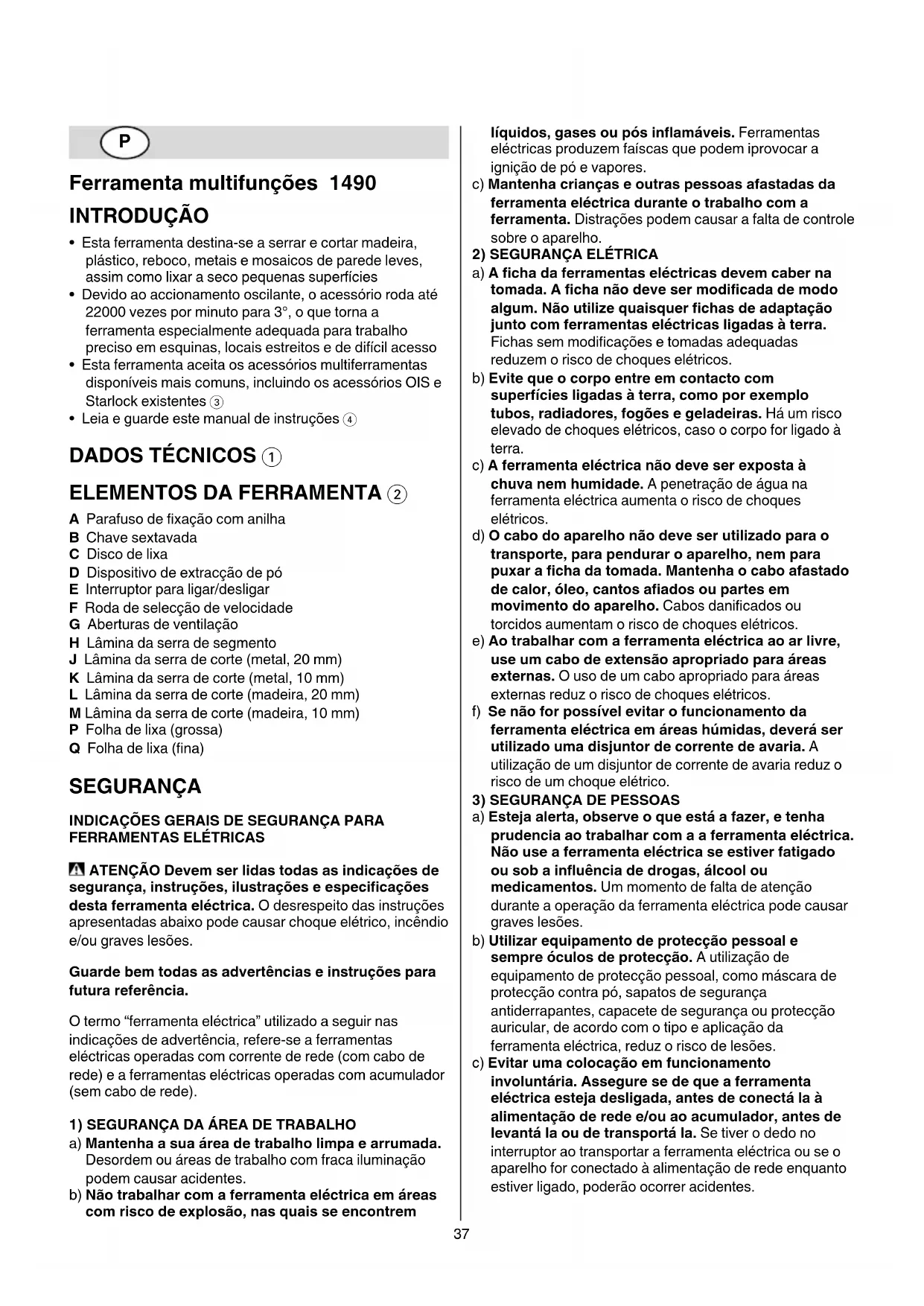 A Parafuso de xação com anilha B Chave sextavada C Disco de lixa D Dispositivo de extracção de pó E Interruptor para ligar/desligar F Roda de selecção de velocidade G Aberturas de ventilação H Lâmina da serra de segmento J Lâmina da serra de corte (metal, 20 mm) K Lâmina da serra de corte (metal, 10 mm) L Lâmina da serra de corte (madeira, 20 mm) M Lâmina da serra de corte (madeira, 10 mm) P Folha de lixa (grossa) Q Folha de lixa (na) SEGURANÇA INDICAÇÕES GERAIS DE SEGURANÇA PARA