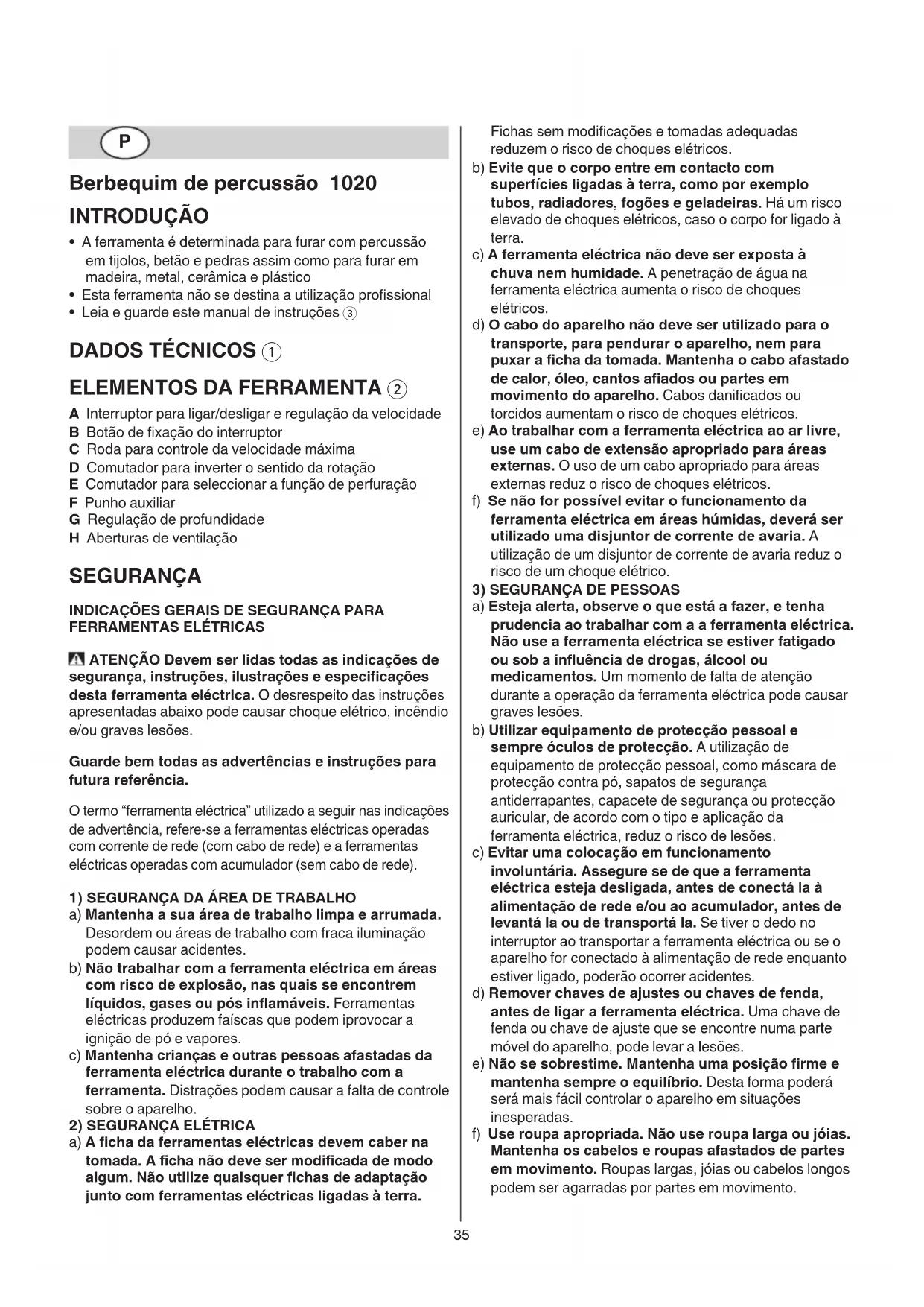 A Interruptor para ligar/desligar e regulação da velocidade B Botão de xação do interruptor C Roda para controle da velocidade máxima D Comutador para inverter o sentido da rotação E Comutador para seleccionar a função de perfuração F Punho auxiliar G Regulação de profundidade H Aberturas de ventilação SEGURANÇA INDICAÇÕES GERAIS DE SEGURANÇA PARA